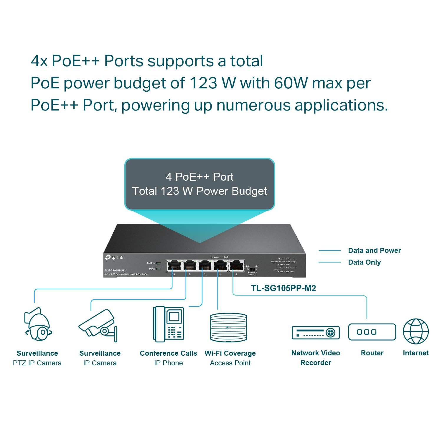 𝐏𝐨𝐰𝐞𝐫 𝐎𝐯𝐞𝐫 𝐄𝐭𝐡𝐞𝐫𝐧𝐞𝐭: 4 PoEplusplus (802.3bt/at/af) ports providing up to 60W per port, supports total PoE budget up to 123W.