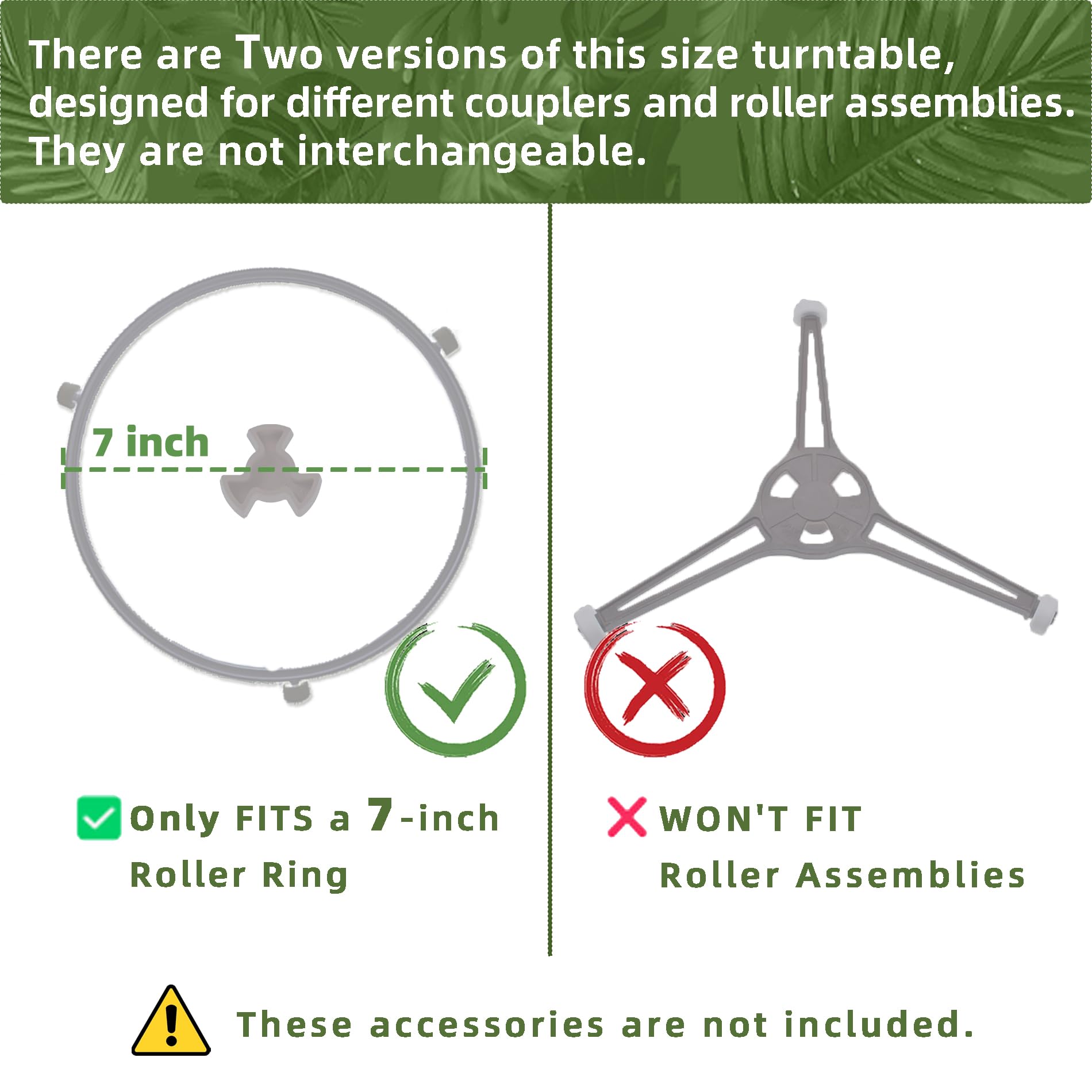 【Measurement 2】The Roller Ring should have a rotating diameter between 6 3/8" and 7 5/8". Please Note: This tray is only compatible with 7-inch roller rings (measured without the white wheels). It will NOT fit the other common 6 1/4-inch roller rings (excluding the white wheels). Please double-check your ring size before purchasing.