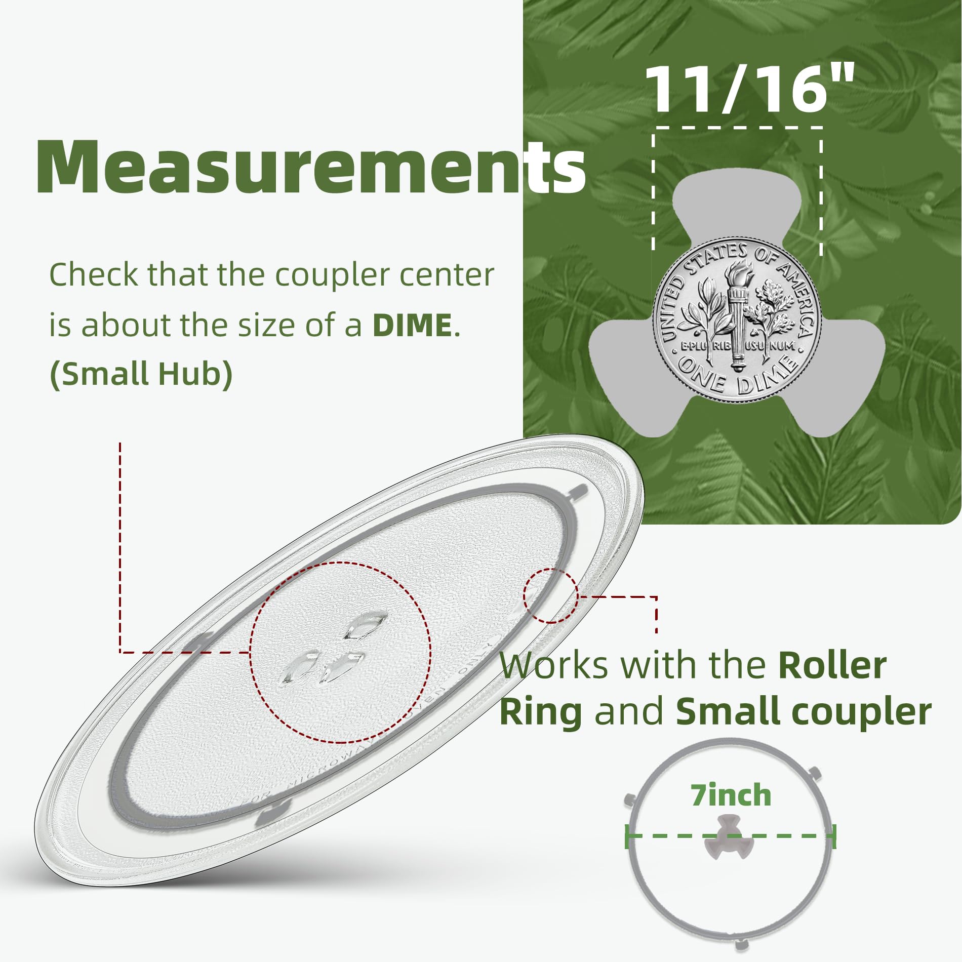 【Measurement 1】This 9.6 inch microwave glass plate has a one-dime sized small coupler hole in the center. The center spot of the microwave turntable plate coupler measures 11/16" in diameter