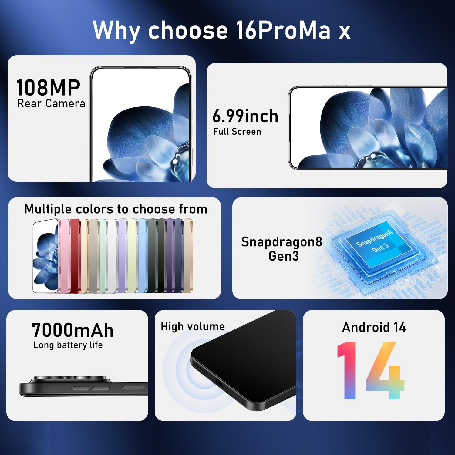 【New upgrade】:Please note that the 16PROMA X is an android phone with a 6.99" HD , bringing you a cinematic experience. Paired with a 120Hz refresh rate, ensuring that you can complete all actions without delay. The unlocked smartphone with face unlocked and Android 14 OS to protect your privacy.