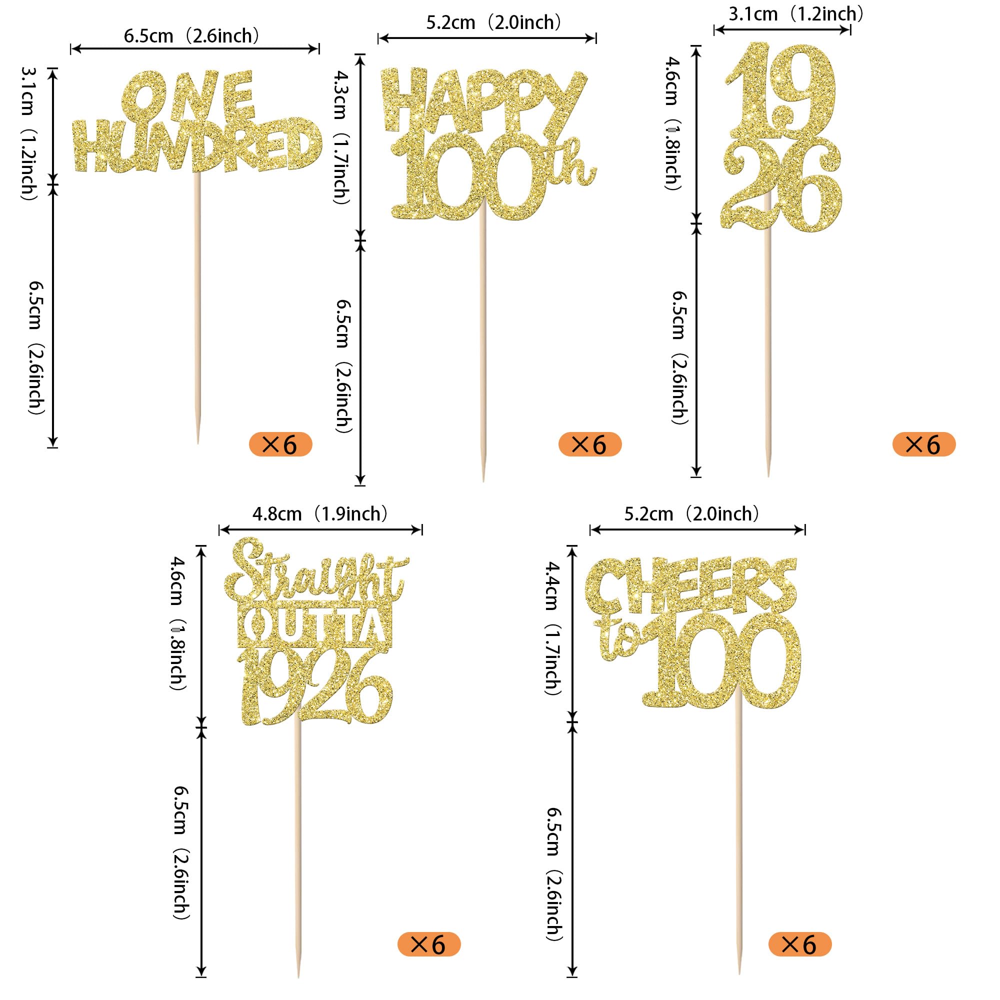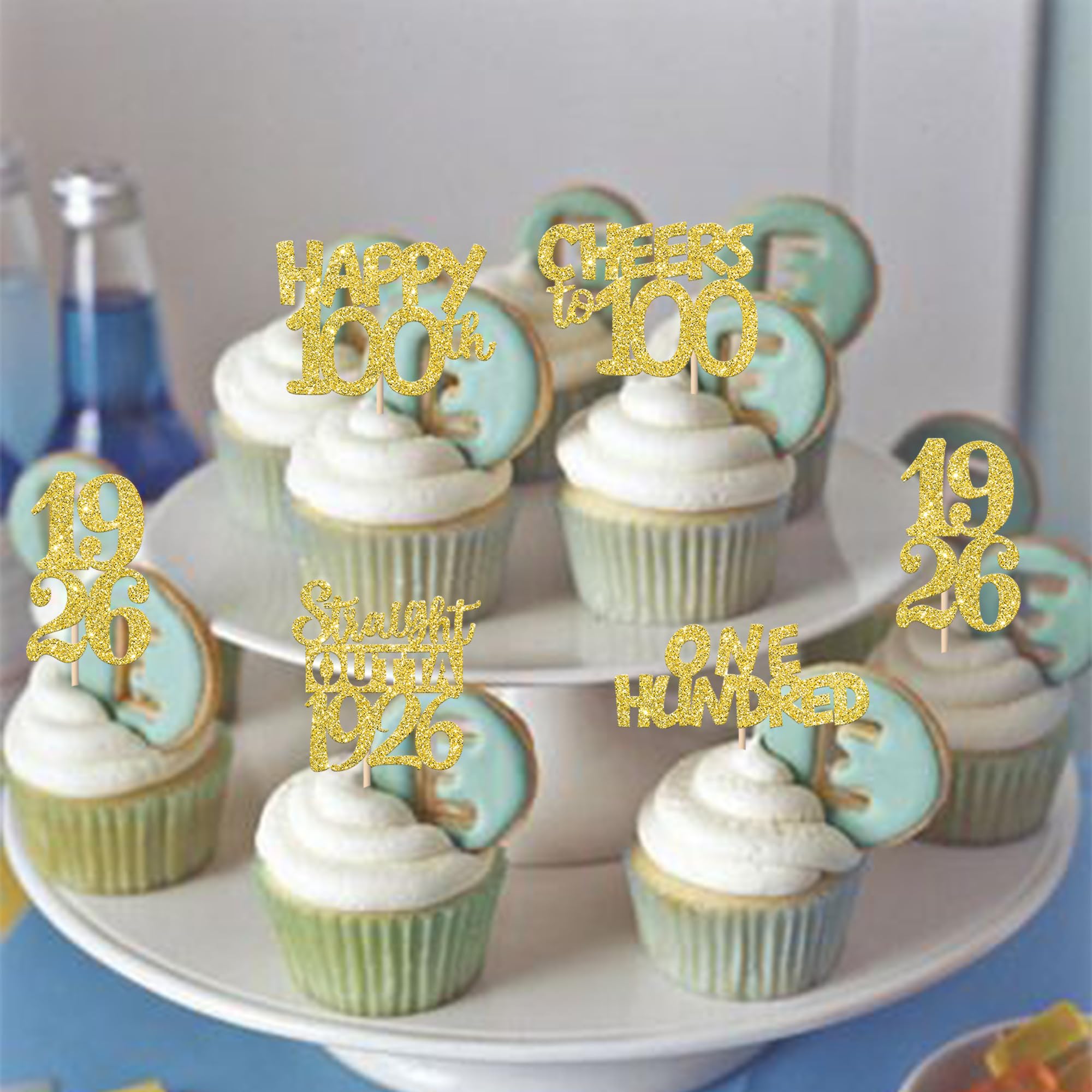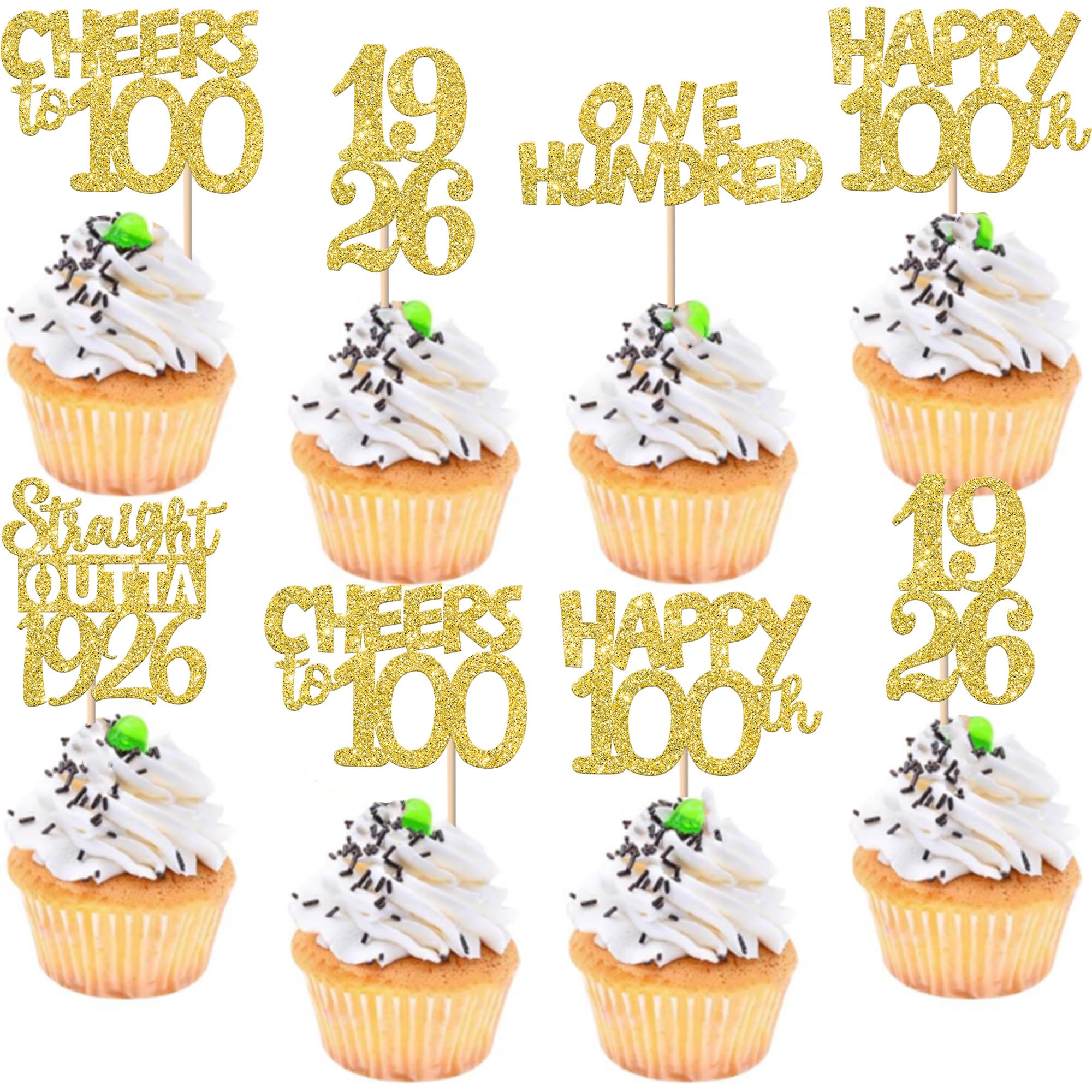 Straight Outta 1926 Cupcake Toppers for Happy 100th Birthday Anniversary Party Cake Decorations Supplies Perfect for happy 100th bithday theme party,straight outta 1926 theme party,100th wedding anniversary theme party,cheers to 100 years theme party cupcake decorations supplies. Pack of 30 pcs,6 pcs of each design The size is 2.6*4.6/ 2.2*4.6/ 1.9*4.6/ 2.1*3.9/ 1.2*4.6 inch ( with stick ) Made of high quality paper card stock,thick and thick and sturdy. These cupcake toppers are single glitter, the back is white, and they are intended for decoration only, please do not put them in oven or microwave. If the item you received has any defects, please contact us for refund.we will deal with it within 24 hours.