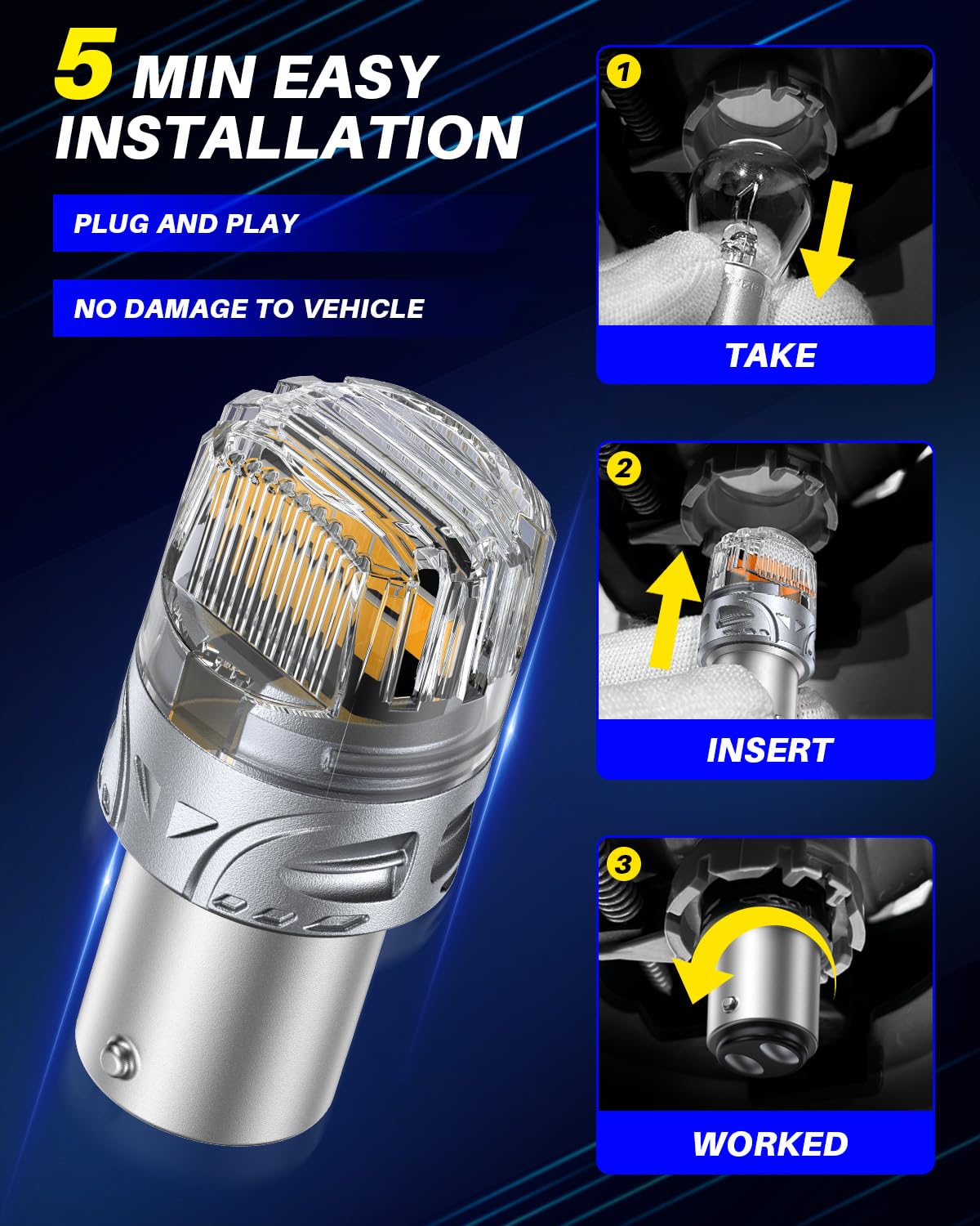 [5-Min Installation]: The AUTOONE upgraded 1157 LED bulb amber yellow is designed for hassle-free installation and compatibility with most vehicles, No polarity/no drilling/no wiring/no damage, just Plug and Play, backed by reliable customer support for a seamless experience.
