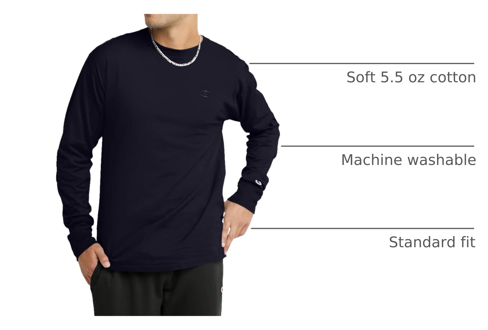 Description A STAPLE FOR ALL SEASONS. A good-to-go long-sleeve shirt is an ideal addition to your year-round wardrobe. Rock this Big & Tall men's long-sleeve T-shirt solo on a breezy night or layer it under your favorite Champion jackets and hoodies for styled warmth. This versatile tee has a soft, worn-in texture you'll love and the cut is made for a Big & Tall frame. The iconic C patch on the chest and sleeve gives that Champion look you trust. From red to black options, there's a look to match your every vibe.