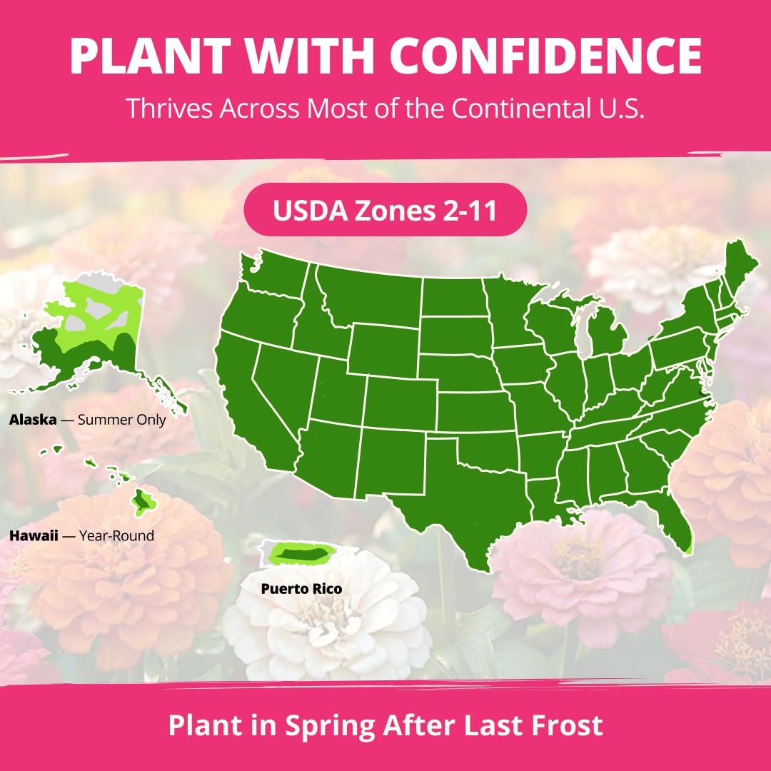GREAT FOR CONTAINERS, BORDERS & BEDS: Growing 24–36 inches tall and 12–18 inches wide, these upright plants bring structure, volume, and vibrant color to raised beds, borders, and decorative pots. HEAT-LOVING & ZONE FLEXIBLE (USDA 2–11): Zinnia Dahlia thrives in full sun and hot, dry climates. Once established, it needs moderate watering and grows best in well-drained, moderately fertile soil.