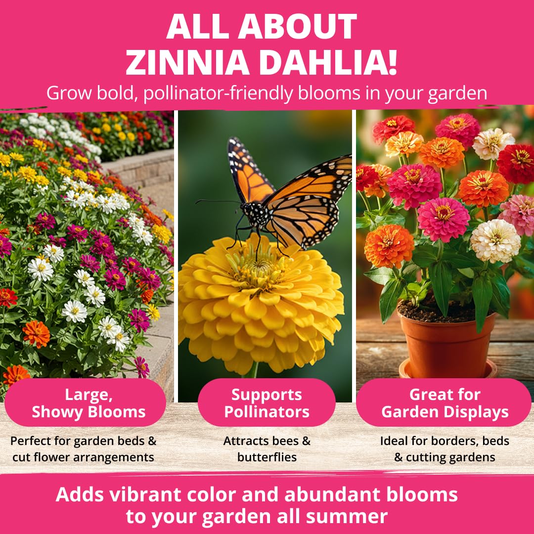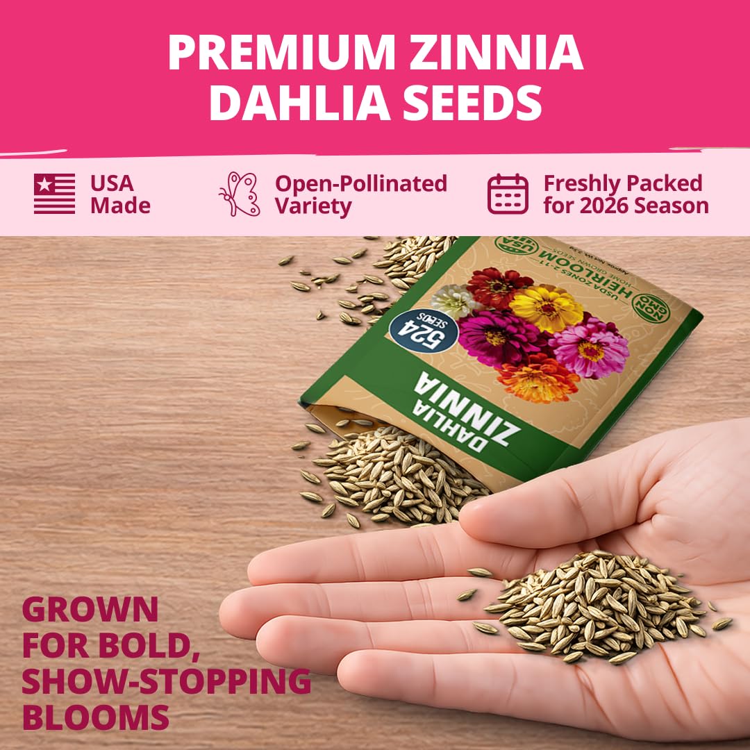 524 PREMIUM SEEDS – BRILLIANT COLOR, FAST GROWTH: This large pack includes 524 USA-packed, high-germination Zinnia Dahlia seeds that bloom into stunning double flowers in red, pink, orange, white, and more. Easy to grow, beginner-friendly, and perfect for bouquets, borders, and containers. Blooms in just weeks and lasts all summer!