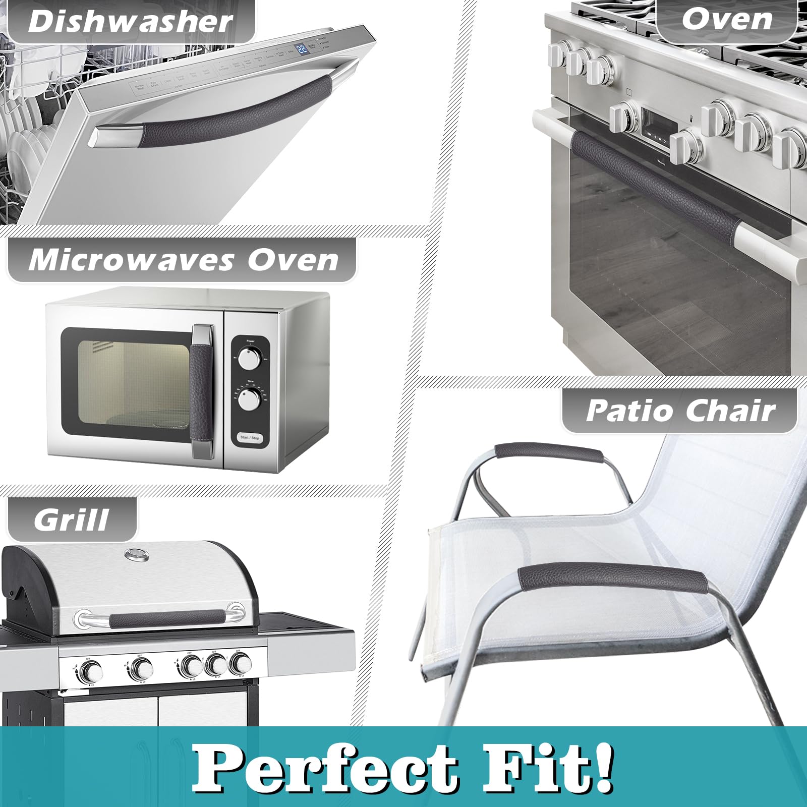 【ADJUSTABLE VELCRO DESIGN】 - Means you can stick the Velcro strip anywhere on the back, so please don't worry about the width! The handle covers can fit perfectly on the fridge door, freezer door, stove, dishwasher, microwave, kitchen cabinet, bathroom door handle, grill handle and even the armrest of the patio chairs outside.