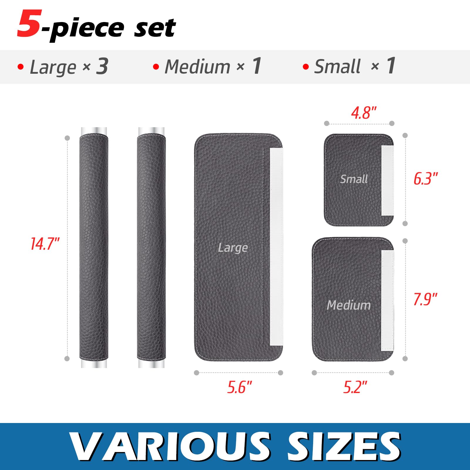 【VARIOUS SIZES & INSTALLATION】 - 5 pieces in total, 3 large handle covers (14.7” long) and 2 short handle covers (7.9” long / 6.3” long). The large ones are Non-Slip design, they are very easy to place on your handles and won't move.