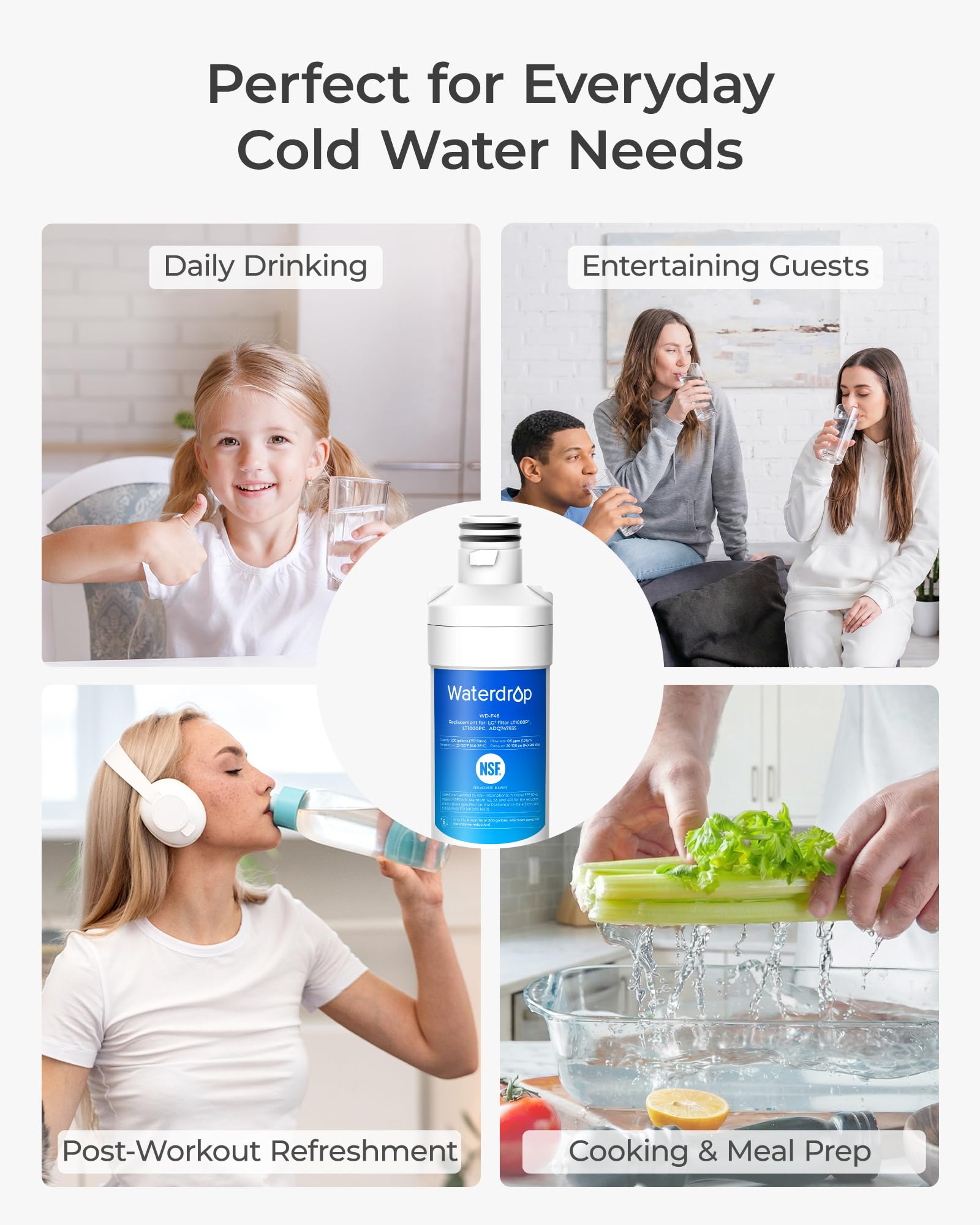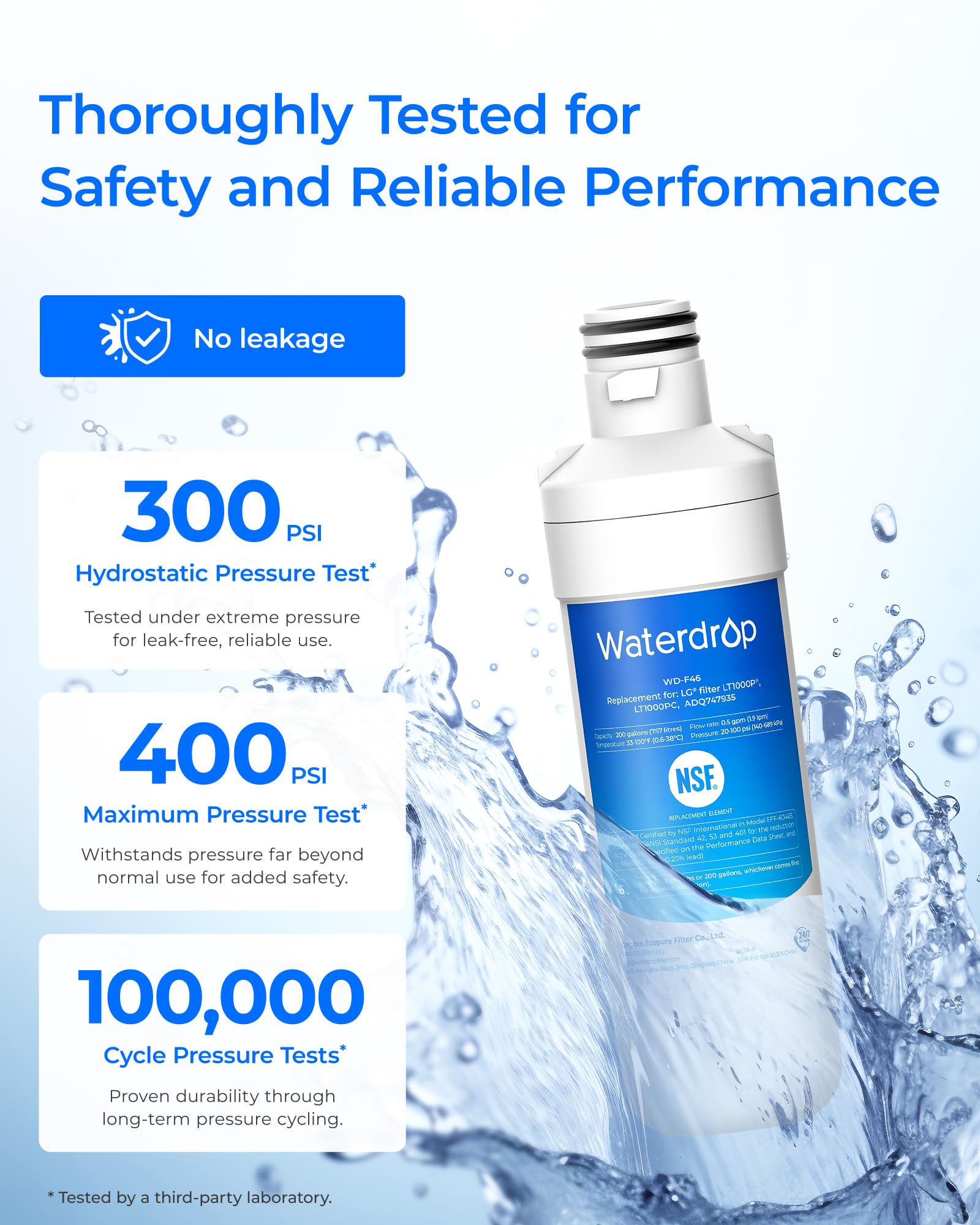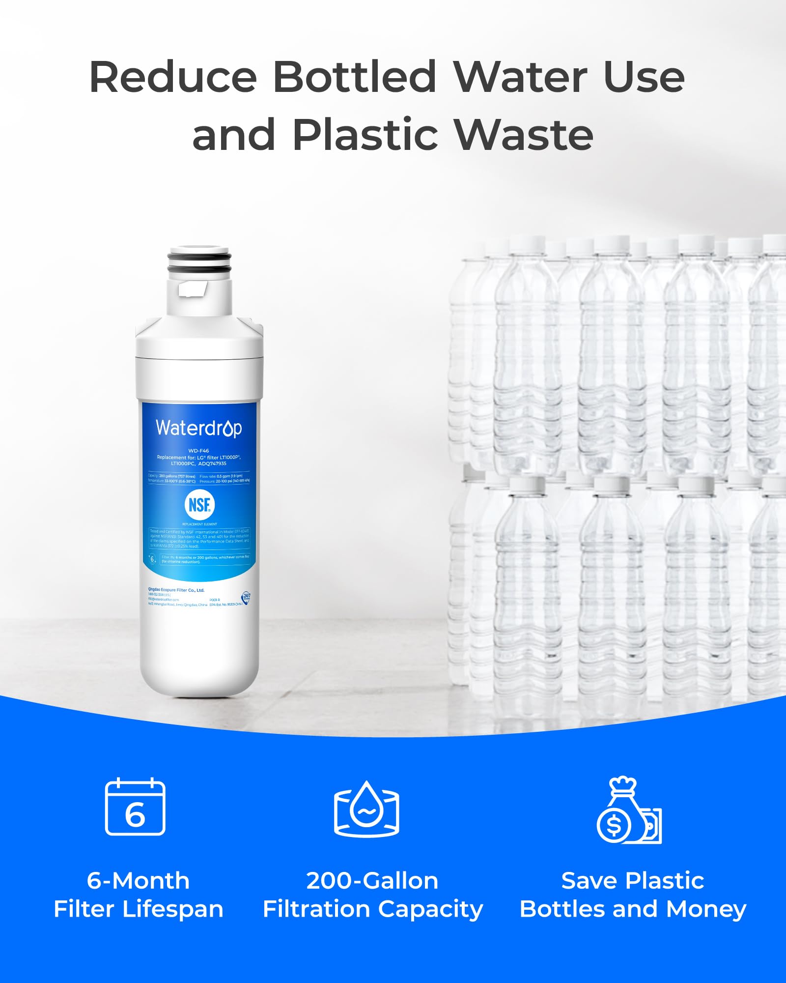[BPA-free and food-grade materials] At Waterdrop, we prioritize your safety. This is why we have used only safe materials in this refrigerator filter, as verified by the NSF 372 certification for lead-free materials.