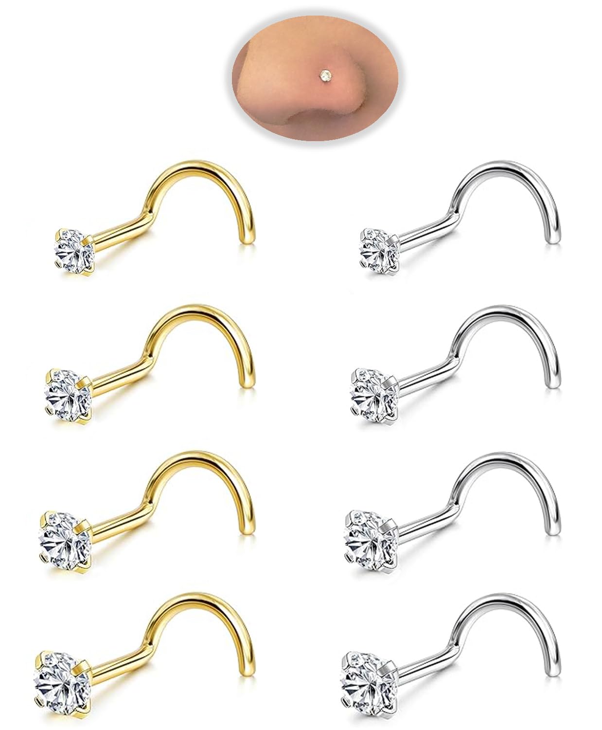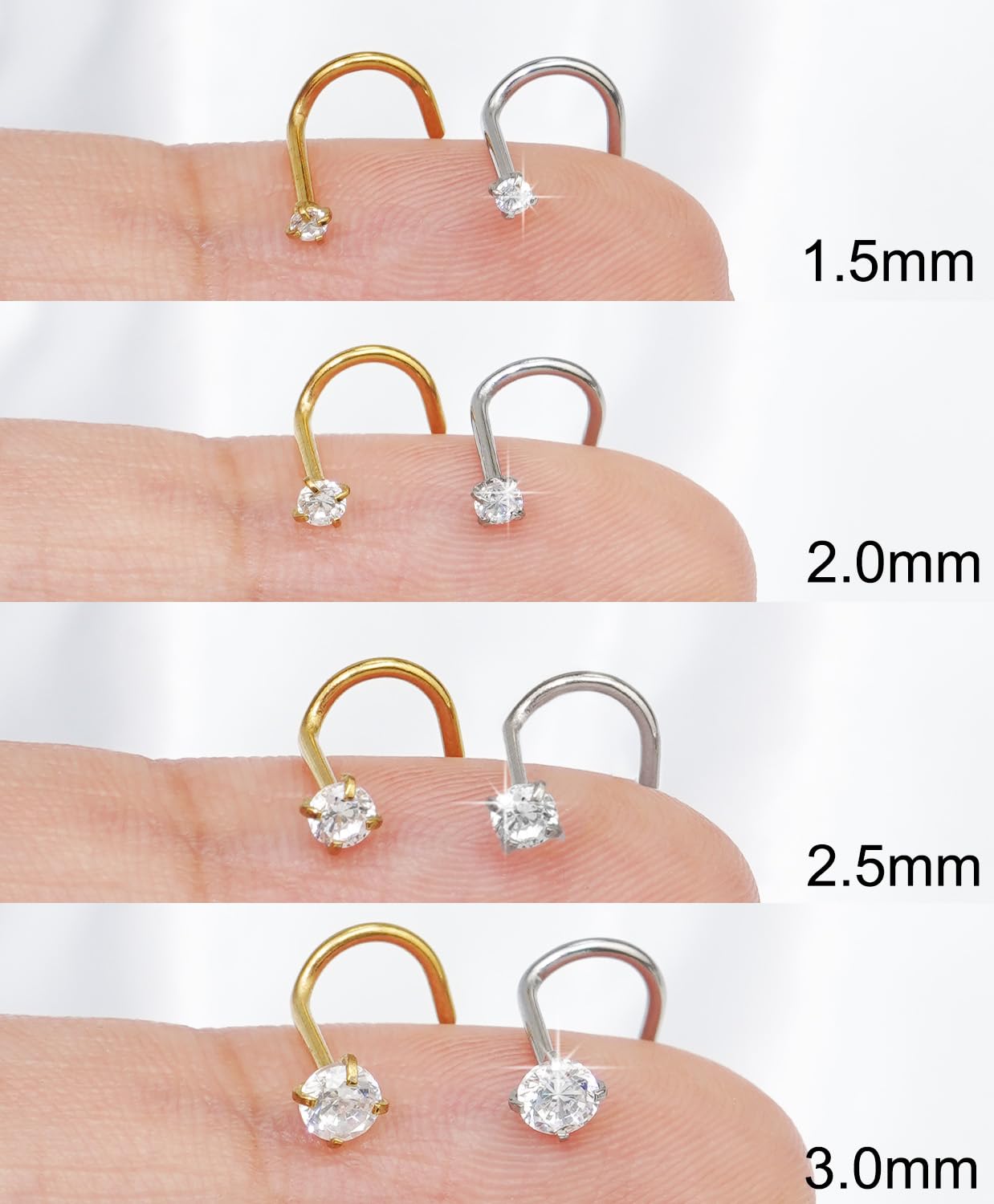 Multiple Size Sets: 8pcs nose studs in a set, All Gauge--22G(0.6mm); Pin Length: 7mm; Cubic Zirconia Size: 1.5/2/2.5/3mm. 22 gauge studs earrings perforation size suitable for most people