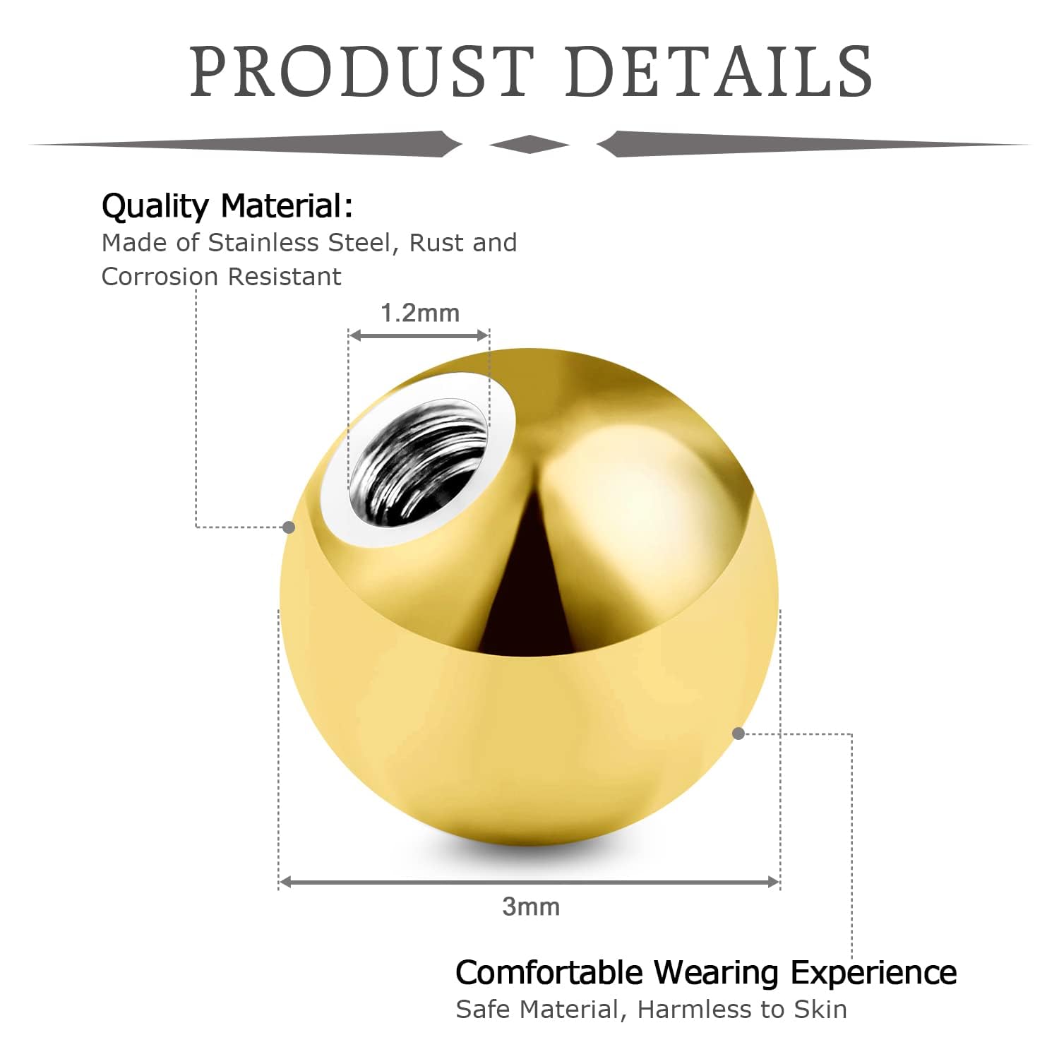 Size: Externally Threaded Replacement Ends for Body Piercing Barbells, the screw hole Size suit for 16G(1.2mm), Ball Size: 3mm