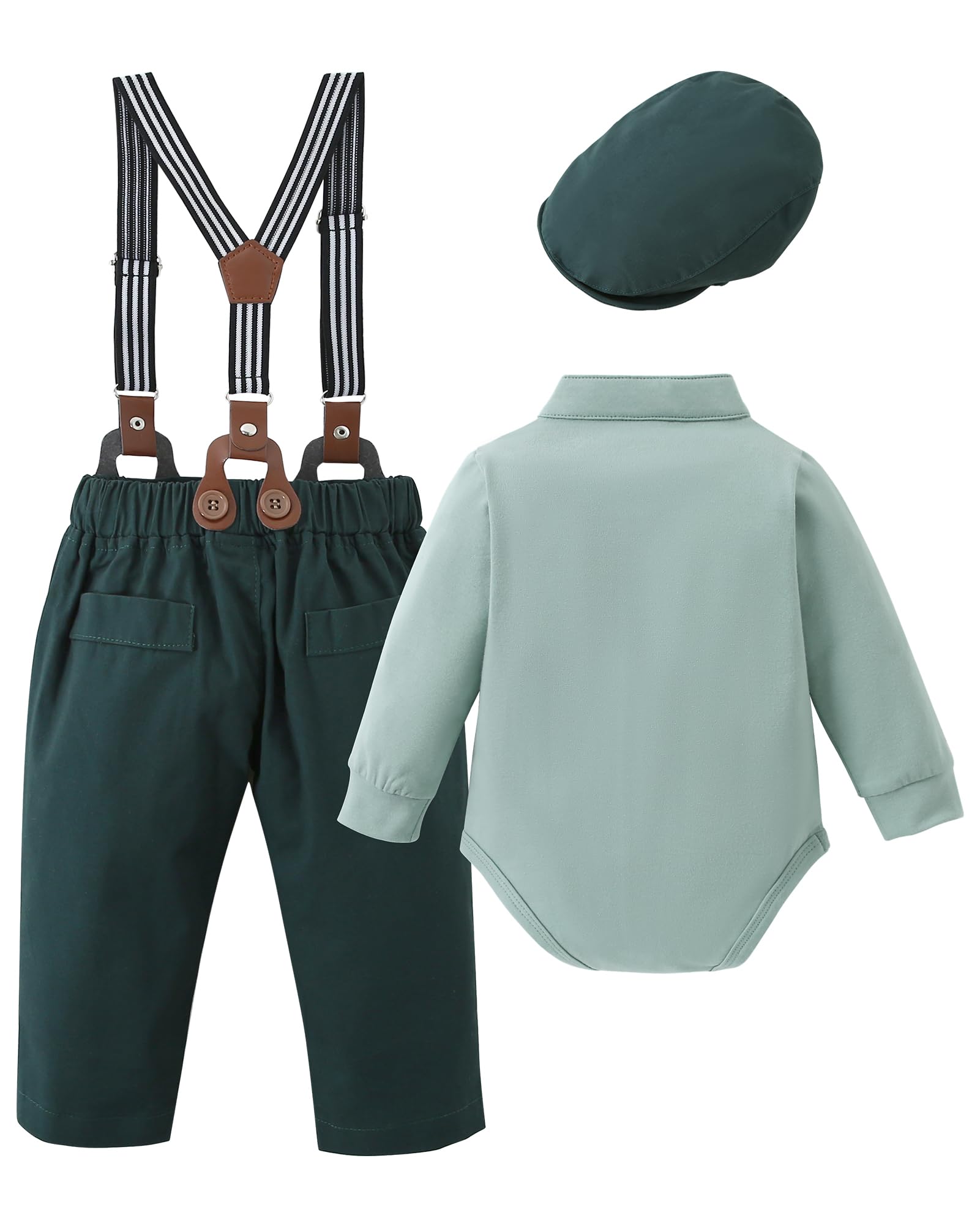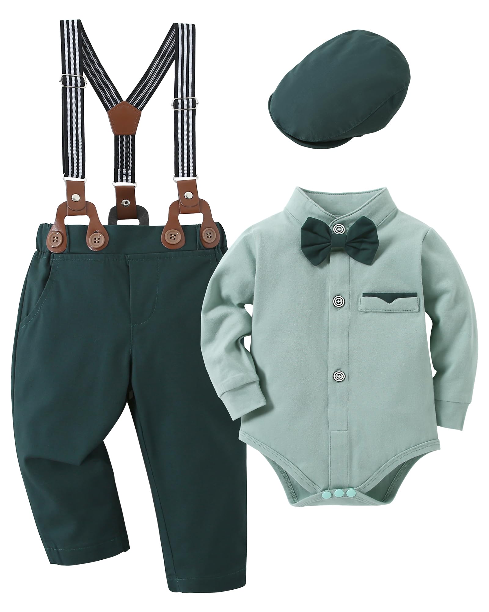 Size Selection: Our baby suits are suitable for newborn boy clothes 0-3 months, 3-6 months baby boy outfit, 6-9 months baby boy suit, baby boy wedding outfits 9-12 months, baby formal outfit boy 12-18 months, and baby tuxedo 18-24 months. Set includes: 1 * shirt+1 * Pants+1 * bow tie+1 * Beret