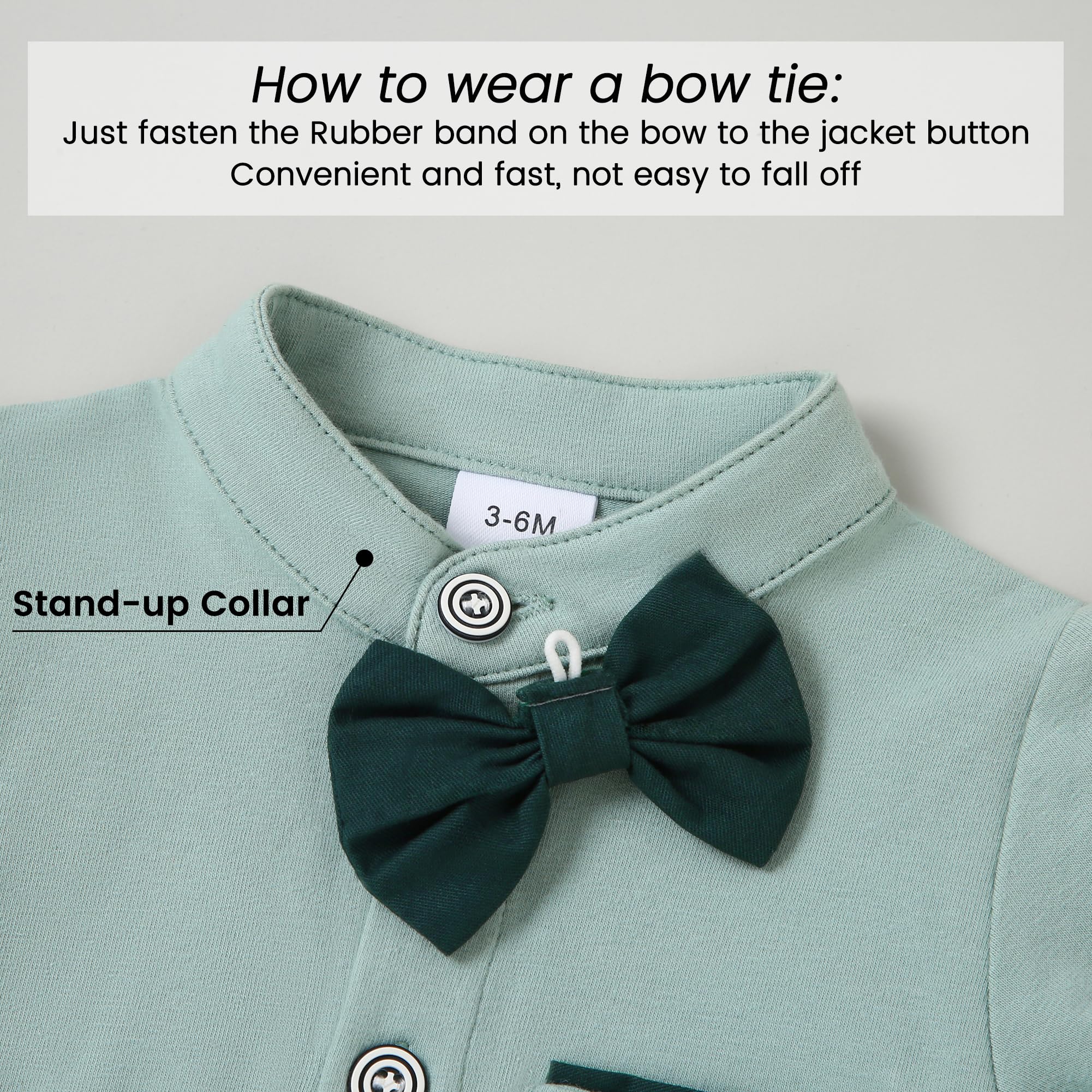 Unique Design: The baby boy suit shirt features a unique stand-up collar design and detachable bow tie, which is fashionable and cute, without worrying about neckline curls or wrinkles. This shirt has buttons on the crotch for easy on and off and diaper changing