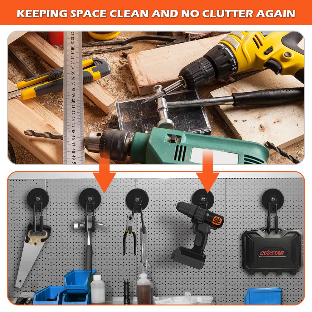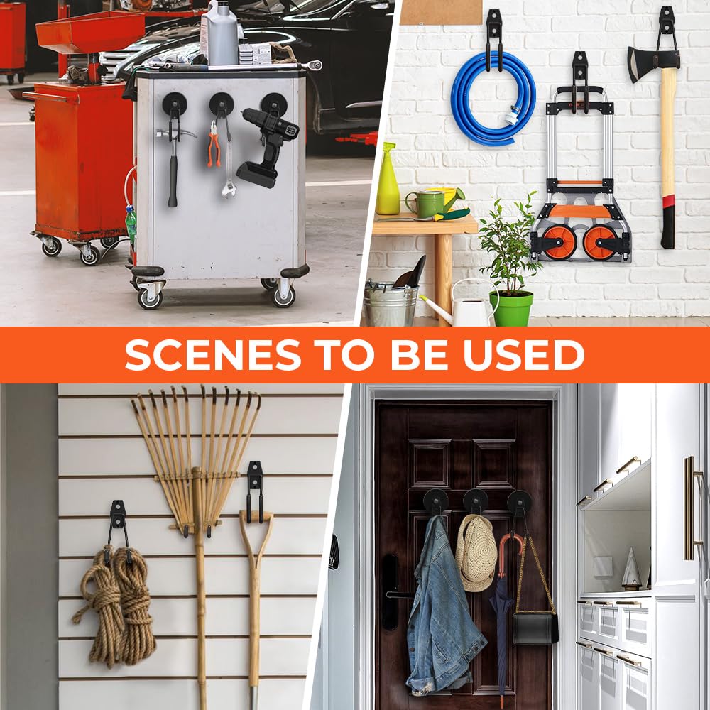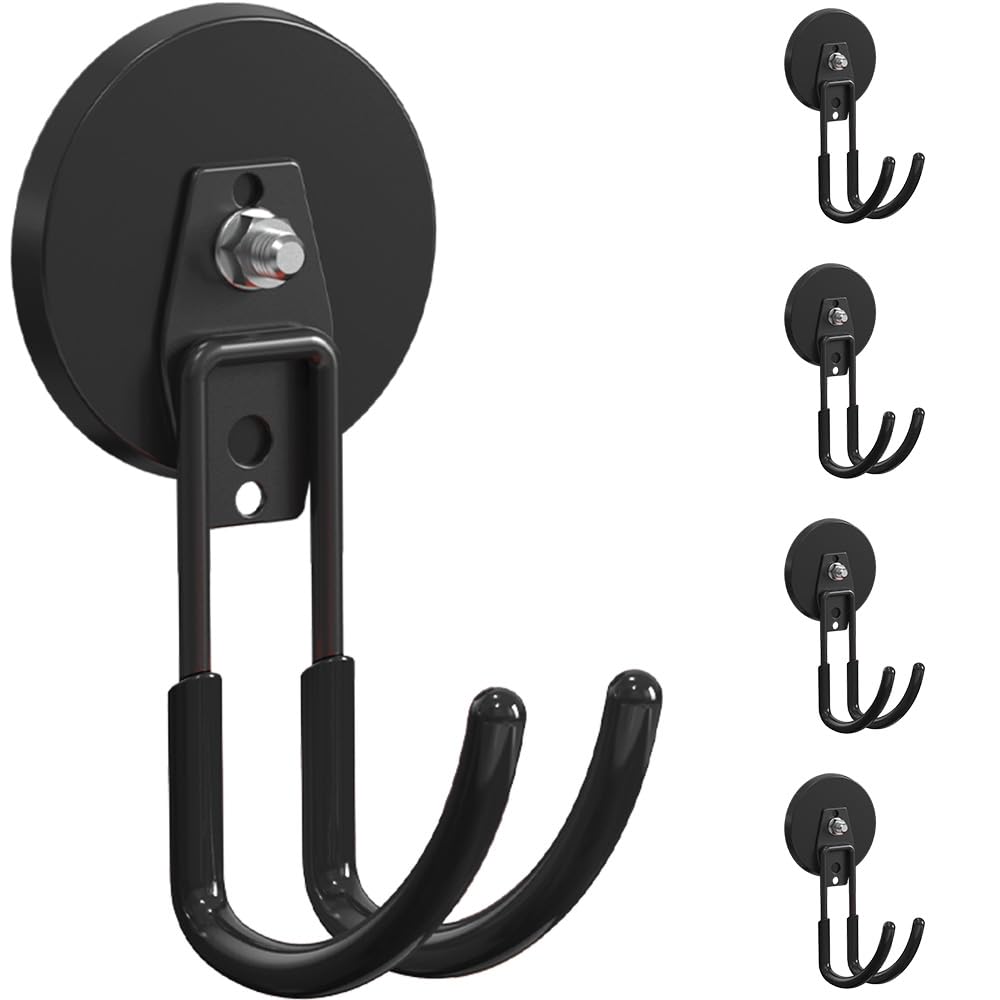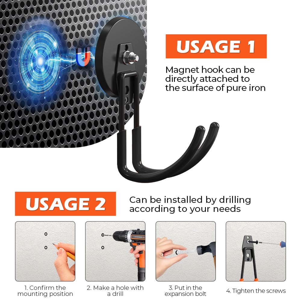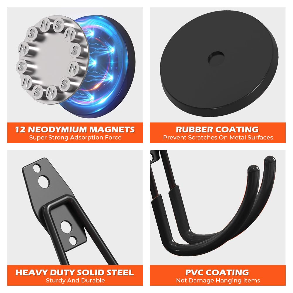 [WIDELY VERSATILE] These super strong magnetic garage storage hooks are incredibly versatile, perfect for organizing almost anything. Use them to hang:Tools (wrenches, power tools, drills, air tools, toolboxes), Cleaning supplies (mops, brooms, dustpans, vacuums), Outdoor gear (ladders, hoses, ropes, extension cords, helmets), Household items (wreaths, towels, kitchen utensils, dog leashes), Storage solutions (backpacks, bags, wire)