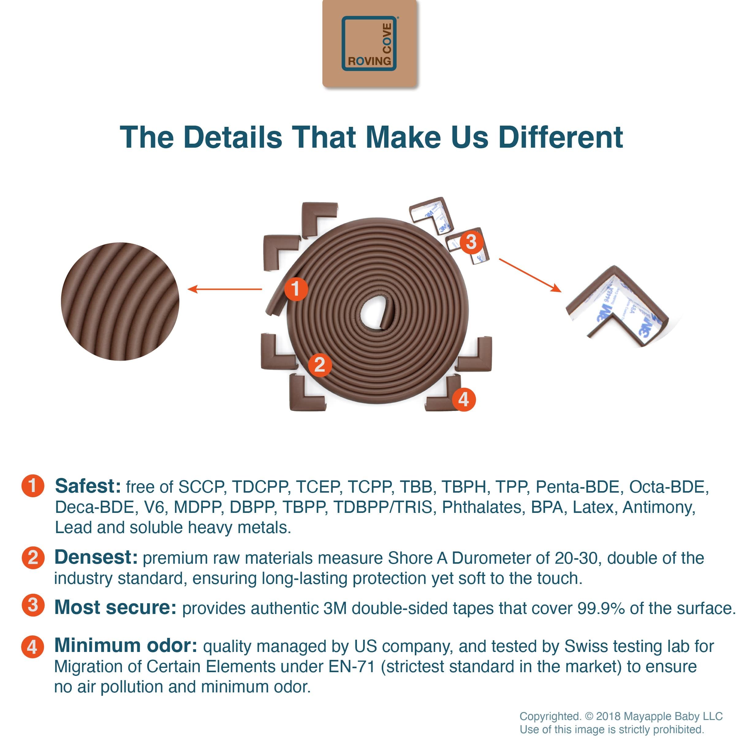 CLEAN SAFETY: Roving Cove uses safe and pure raw material and was the first brand to make foam safety bumpers without the use of toxic flame-retardant chemicals (SCCPs). Our edge corner guards contain no BPA, no phthalates, no heavy metals, no latex, no SCCPs. Inherently flame-resistant; passed flammability tests under US regulations.