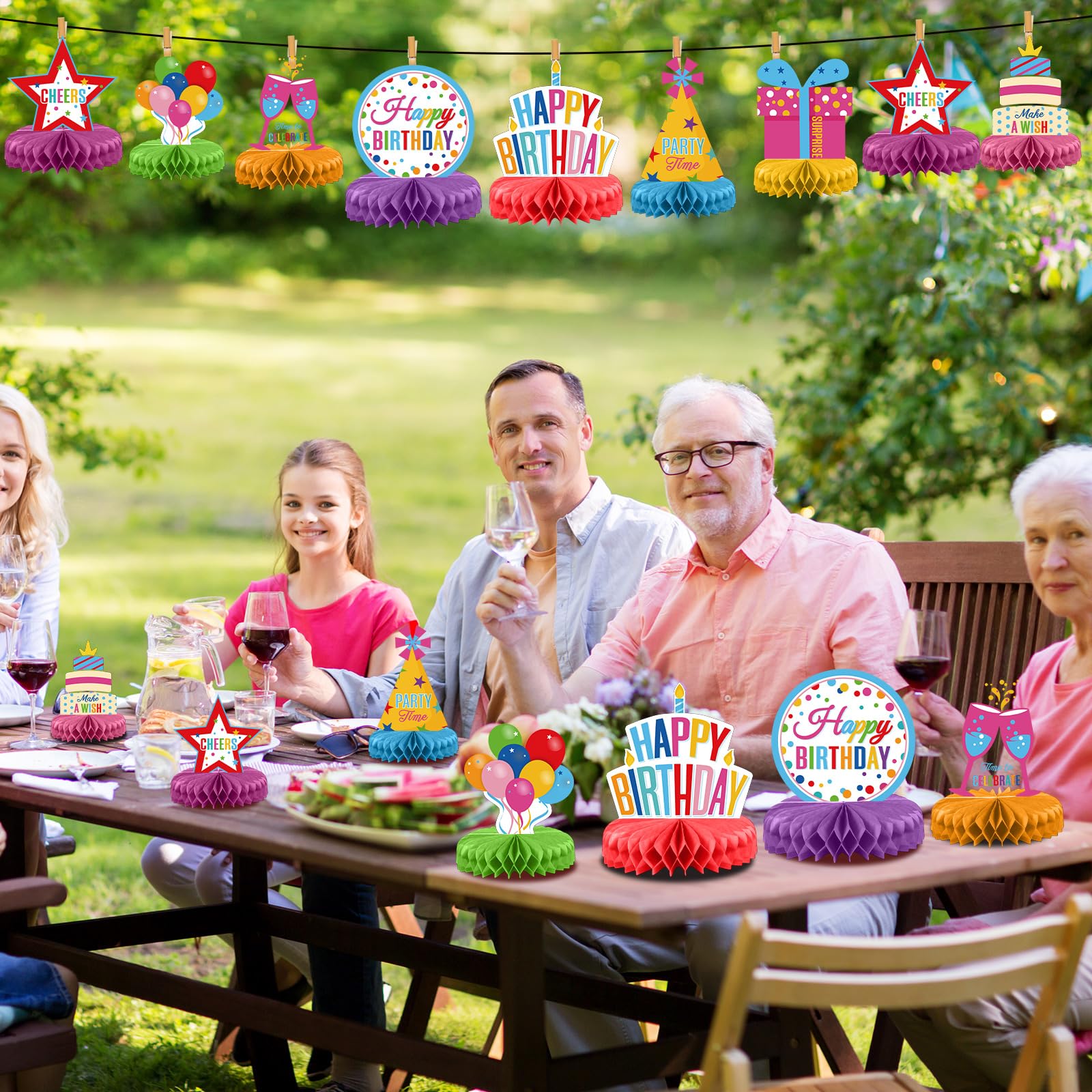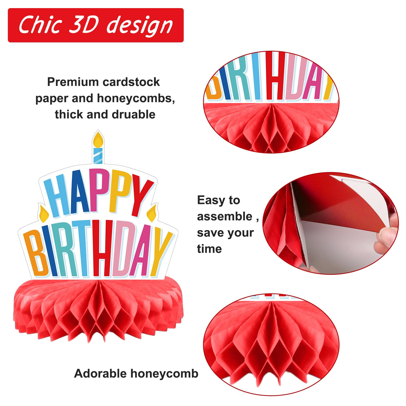 Easy to Assemble: our colorful birthday table centerpiece decorations are reserved with stickers, you only need to tear off the honeycomb sticker, paste the honeycomb ball to the bottom of the card and fix it, and finally gently unfold the honeycomb ball by hand, which can complete the assembly, simple and convenient