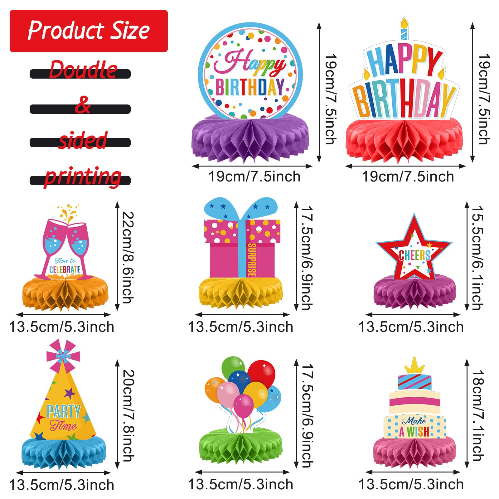 Package Includes: you will receive 8 colorful birthday party honeycomb centerpieces in 8 different designs, sufficient quantity and various styles to meet your birthday party decoration needs and make your birthday themed party a hit