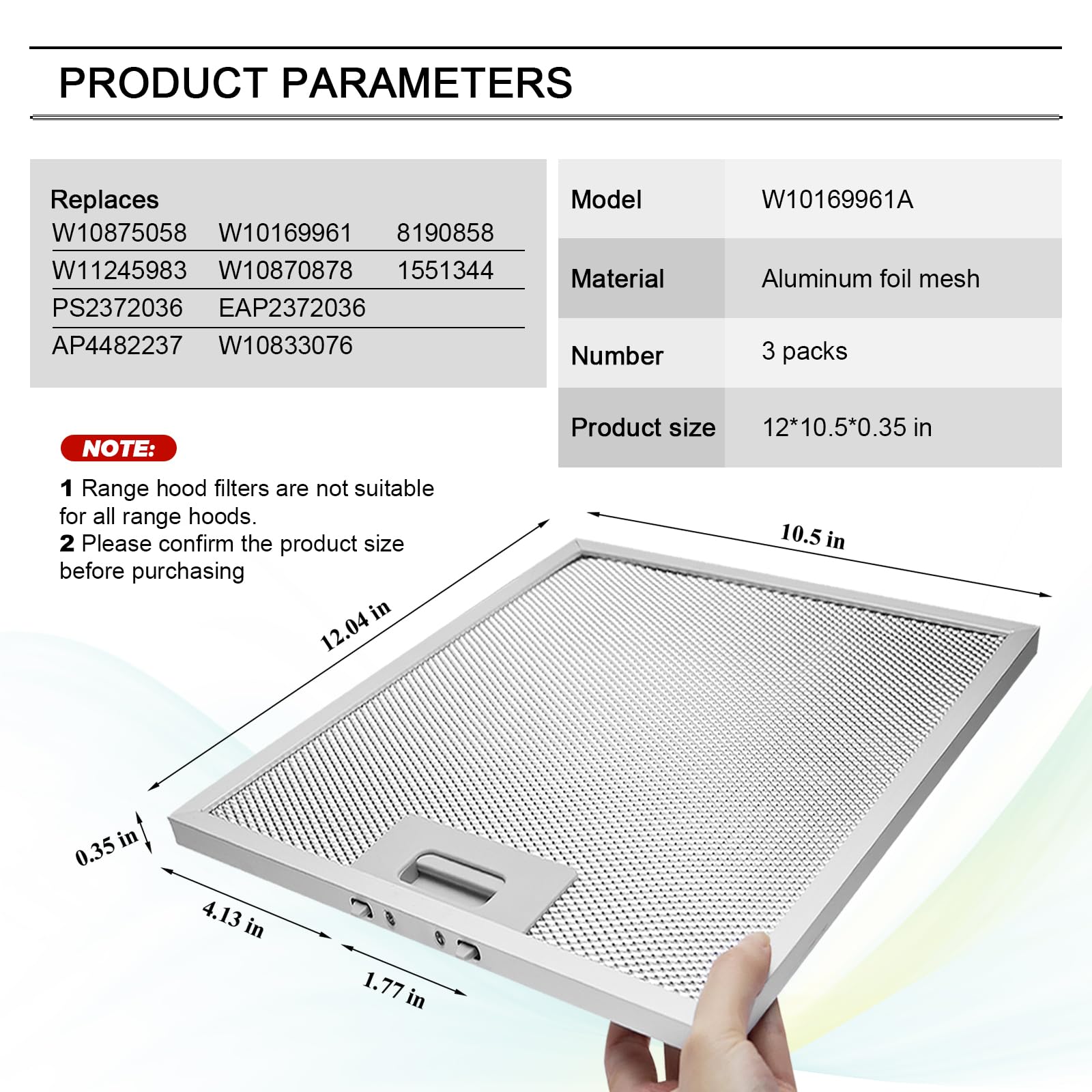 โโใW10169961A RANGE HOOD GREASE FILTERใ:Package includes 3 x W10169961A Range Hood Filter. ๐ง๐ต๐ถ๐ ๐ฟ๐ฎ๐ป๐ด๐ฒ ๐ต๐ผ๐ผ๐ฑ ๐ณ๐ถ๐น๐๐ฒ๐ฟ ๐บ๐ฒ๐ฎ๐๐๐ฟ๐ฒ๐ ๐ญ๐ฌ.๐ฑ" ๐ซ ๐ญ๐ฎ" ๐ซ ๐ฌ.๐ฏ๐ฑ". The range hood filter can perfectly capture air pollutants, whether you are cooking on a gas or electric stove. W10169961A Range Hood Filter has strong pressure folding, reduces wind resistance, and fast air circulation, use it to easily remove grease and oil from cooking and keep kitchen-air fresh and safe