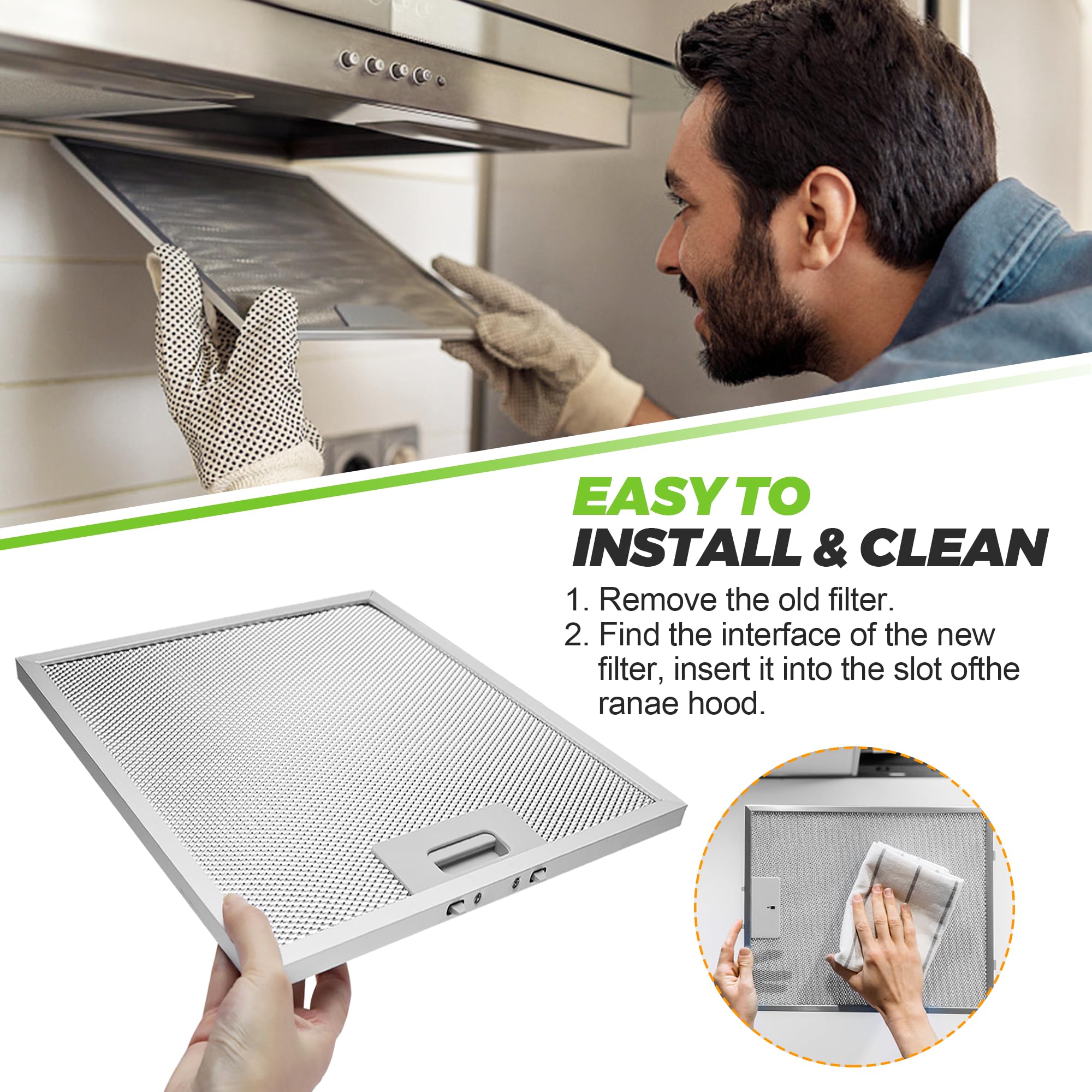 โโใEASY TO INSTALLใ:Installing this Range Hood Grease Filter accessory will not require tools or repair experience. Simply find the interface for the new filter and insert it into the slot on the range hood. Cleaning Tips: Soak in a solution of hot water and degreaser for 10-20 minutes. Agitate gently to remove loosened grease. To maintain the performance of the range hood, maintain air circulation and eliminate odor, recommends replacing the filter every 3-6 months
