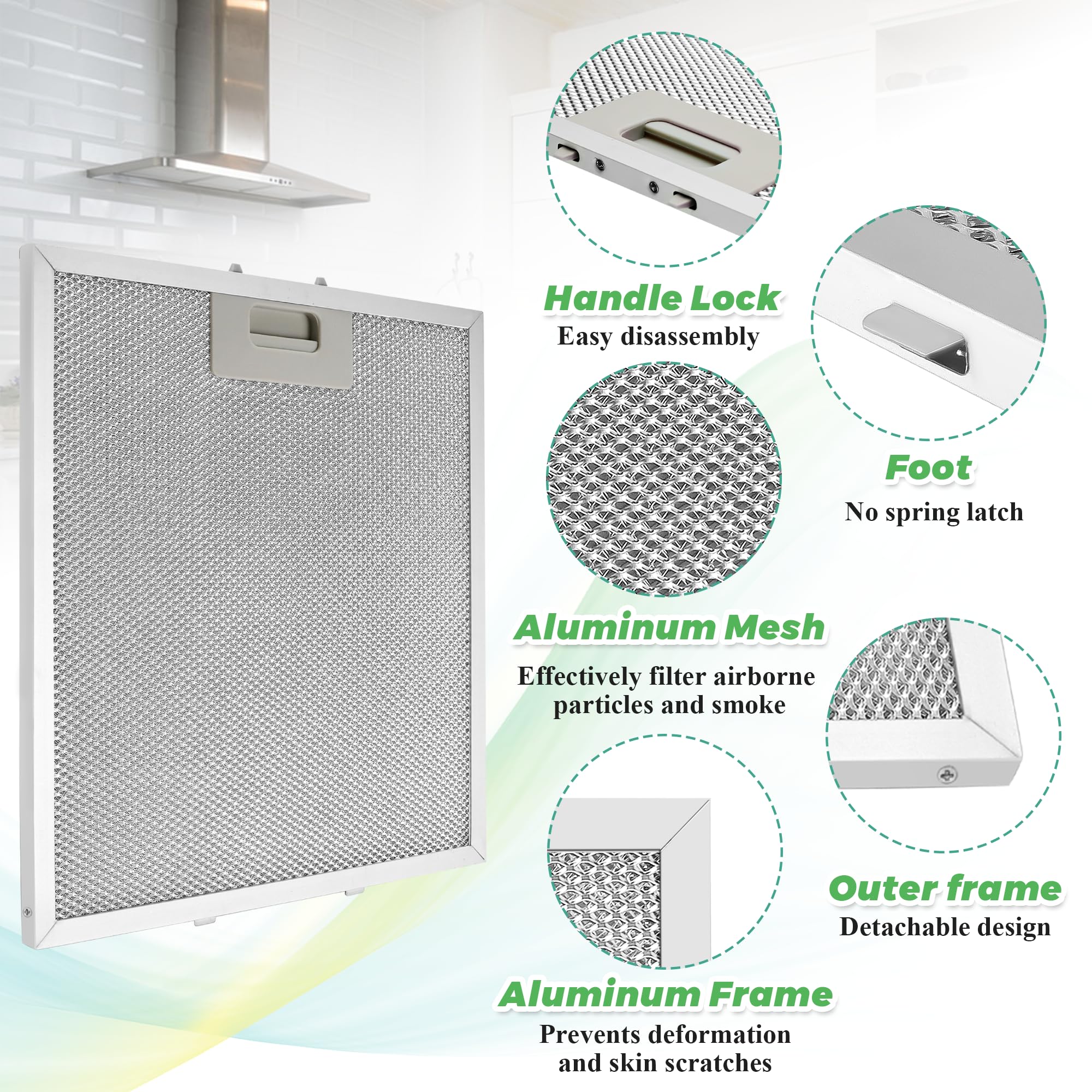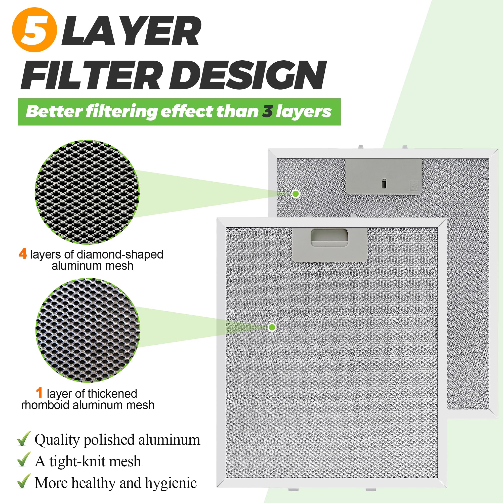โโใCOMPATIBLE MODELใ:W10169961A Range Hood Filter replacement for Whirl-pool, Kitchen-Aid, I-kea,Jenn-Air Range Hoods. Replaces: AP4482237, 1551344, 8190858, AH2372036, EA2372036, PS2372036, W10169961, W10833076, W10870878, W10875058, W11245983. This Range Hood Grease Filter is for many compatible range vent hoods, and replaces used, not clean and damaged grease filters; 5 layers of aluminum mesh layer design, filtering effect is better than 3 layers