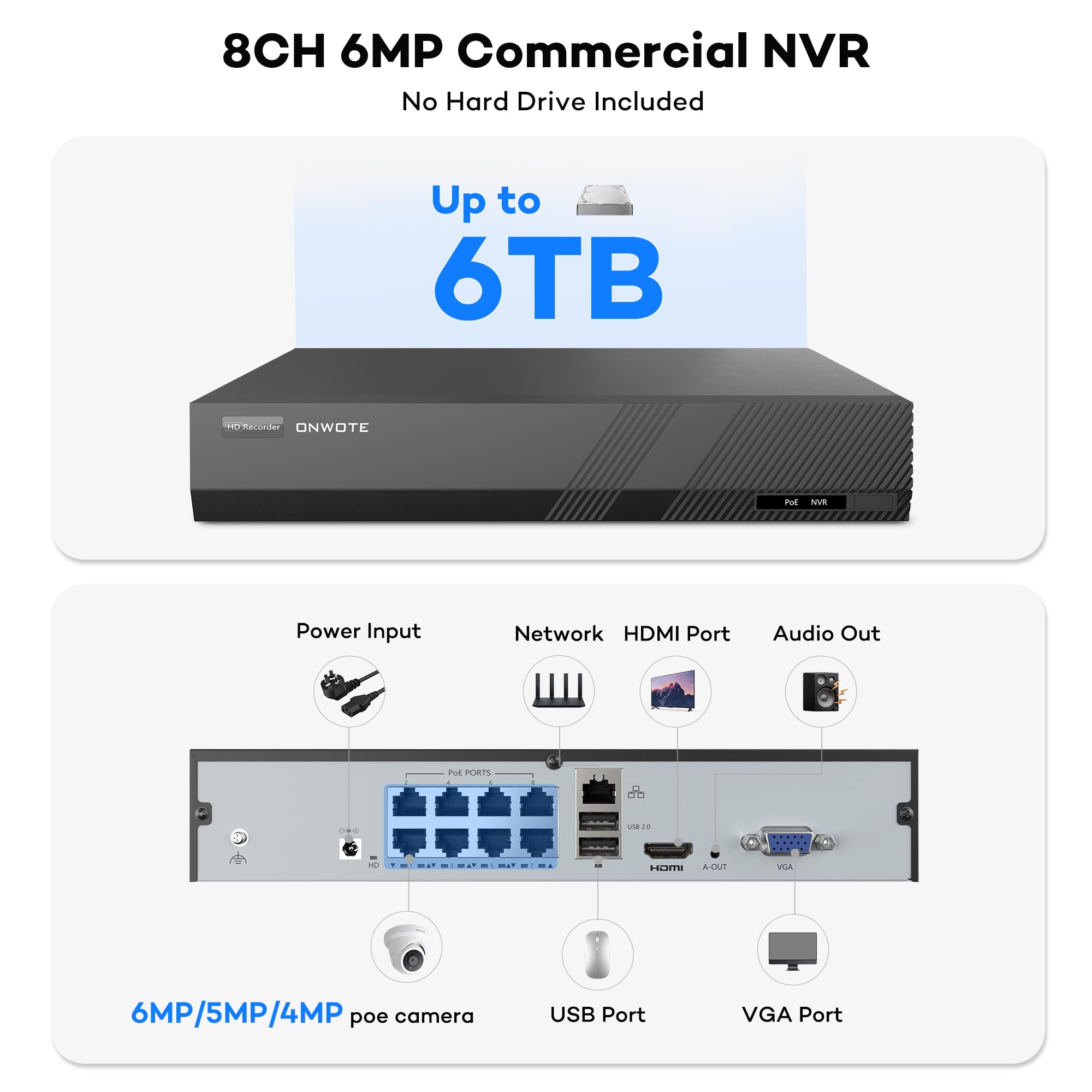 Power over Ethernet, Plug and Play. PoE NVR provides power to cameras via ethernet cables.