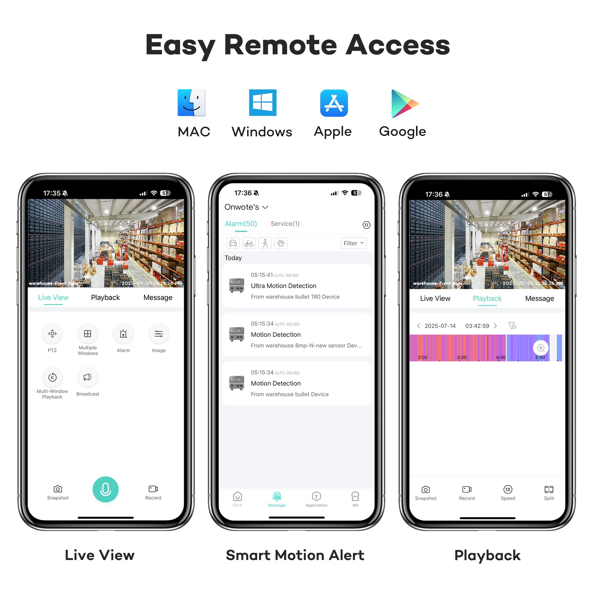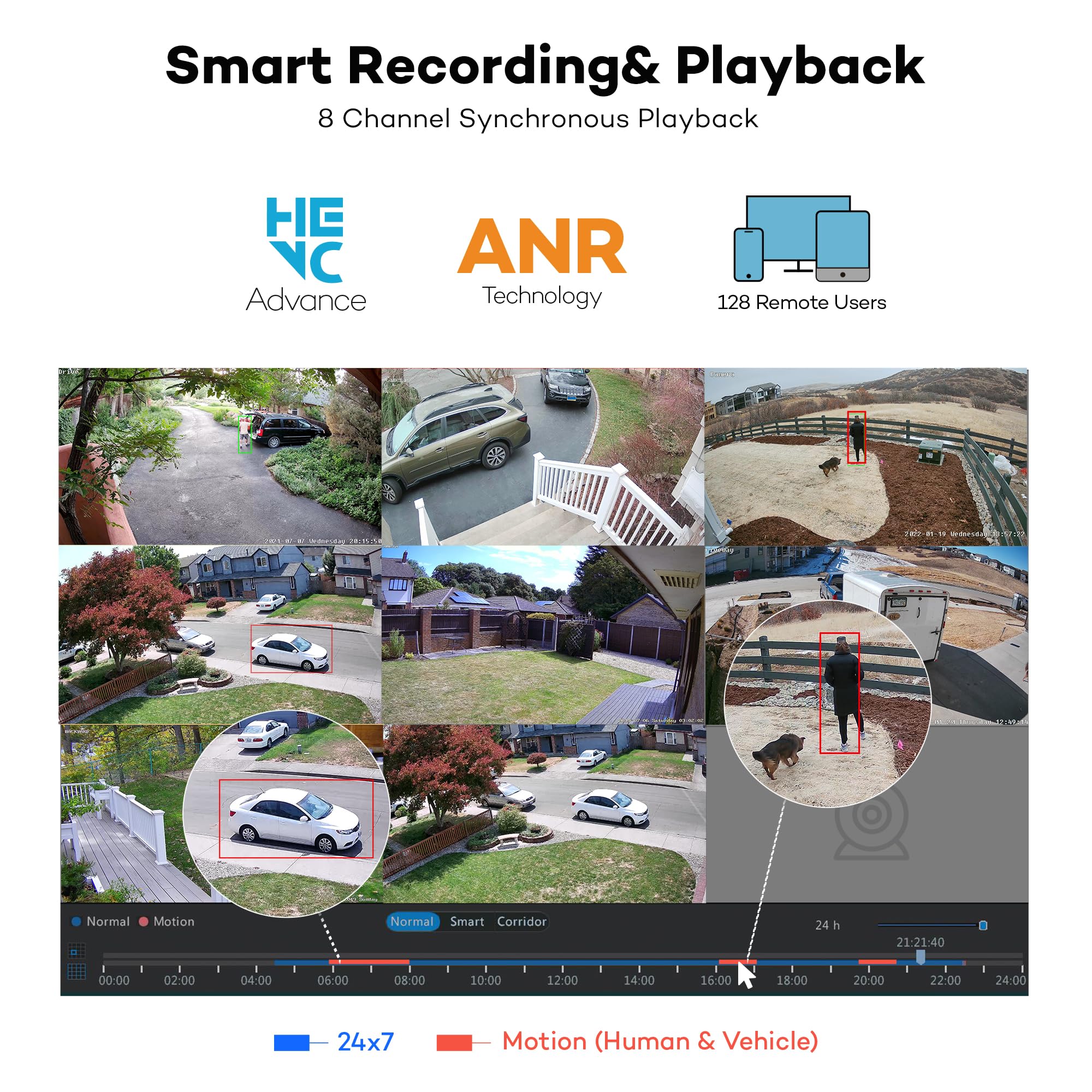 8 Channel Synchronous Playback-- Find video efficiently with the person/ vehicle event filter. Playback 8 cameras simultaneously on HD monitor or computer.