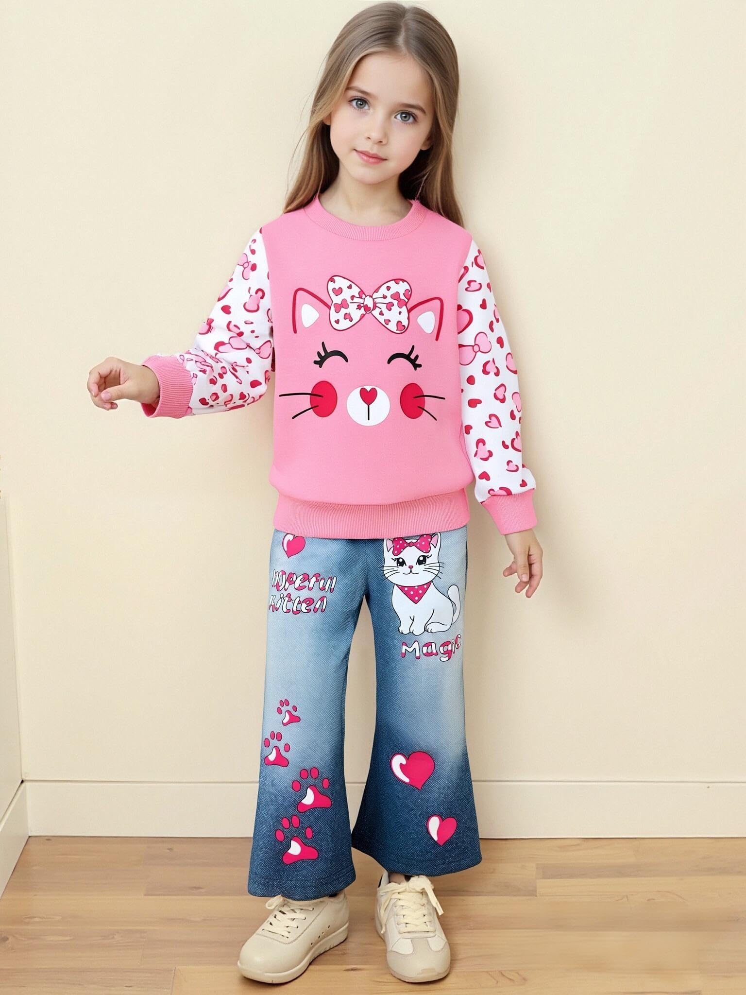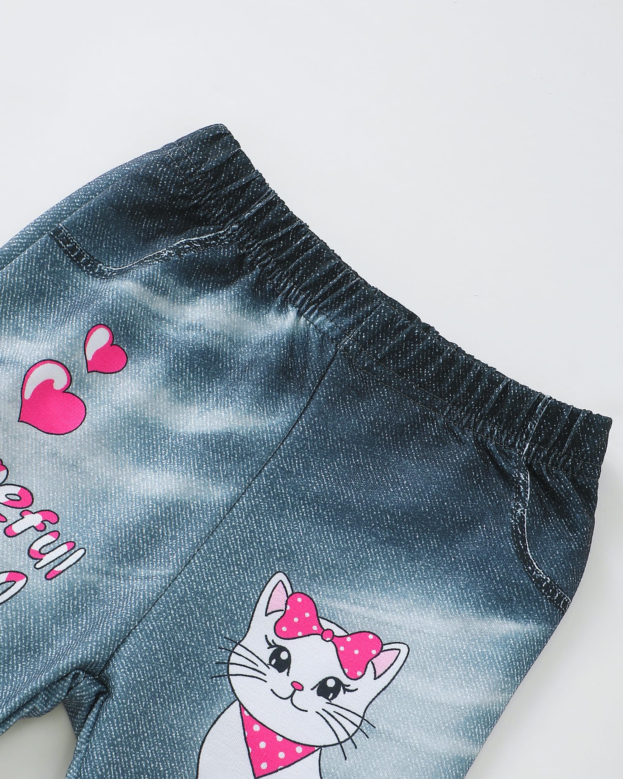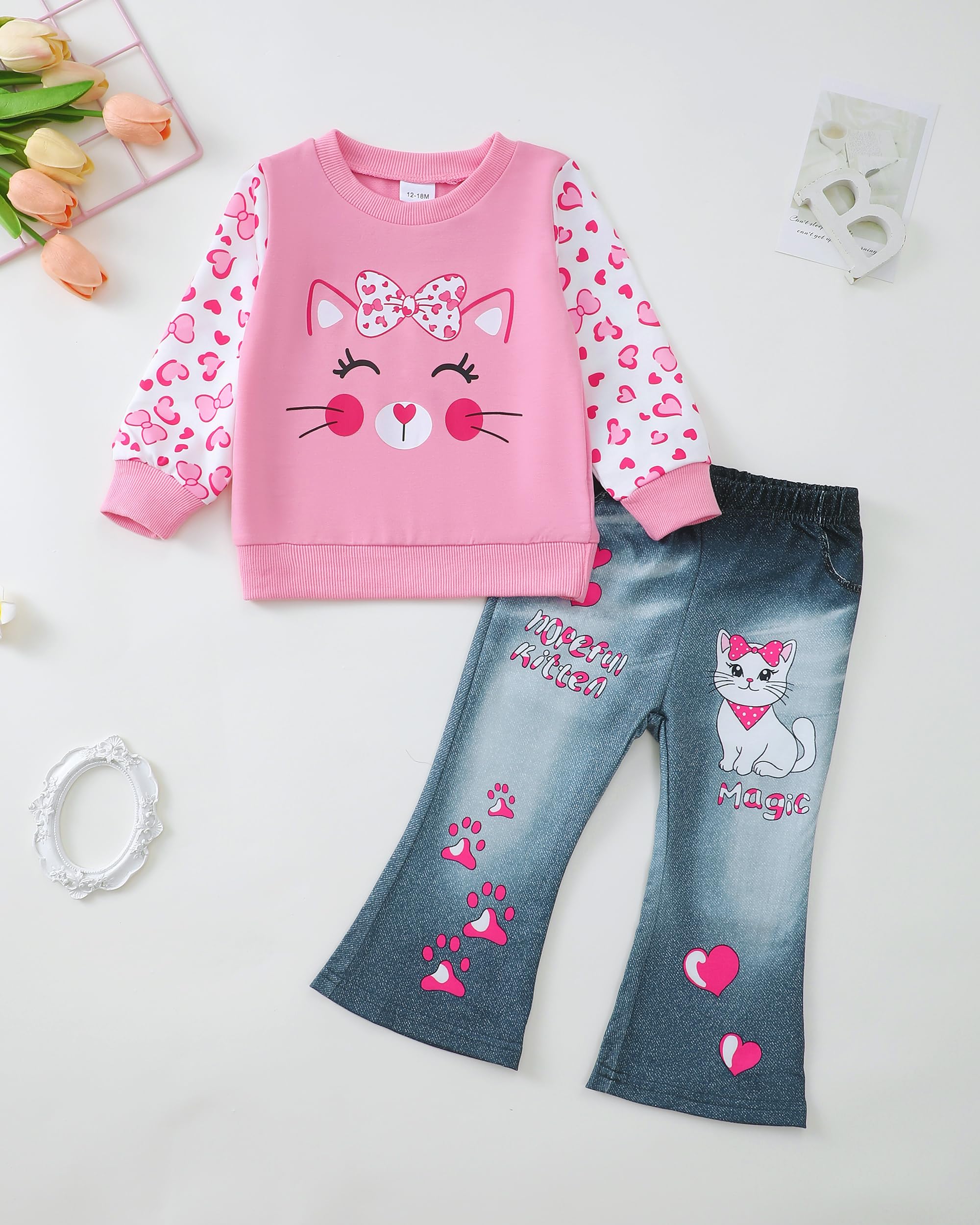 Fun Design: Our baby girl bell bottom outfit feature playful prints of flowers, cats, butterflies, and girl faces on the top. These baby pants showcase a trendy faux denim print, offering the look of denim with added softness. The elasticated waistband ensures a comfortable, perfect fit, making this clothing set ideal for casual wear or for creating a chic look. Please note: these are not real denim, and the pants do not have pockets!