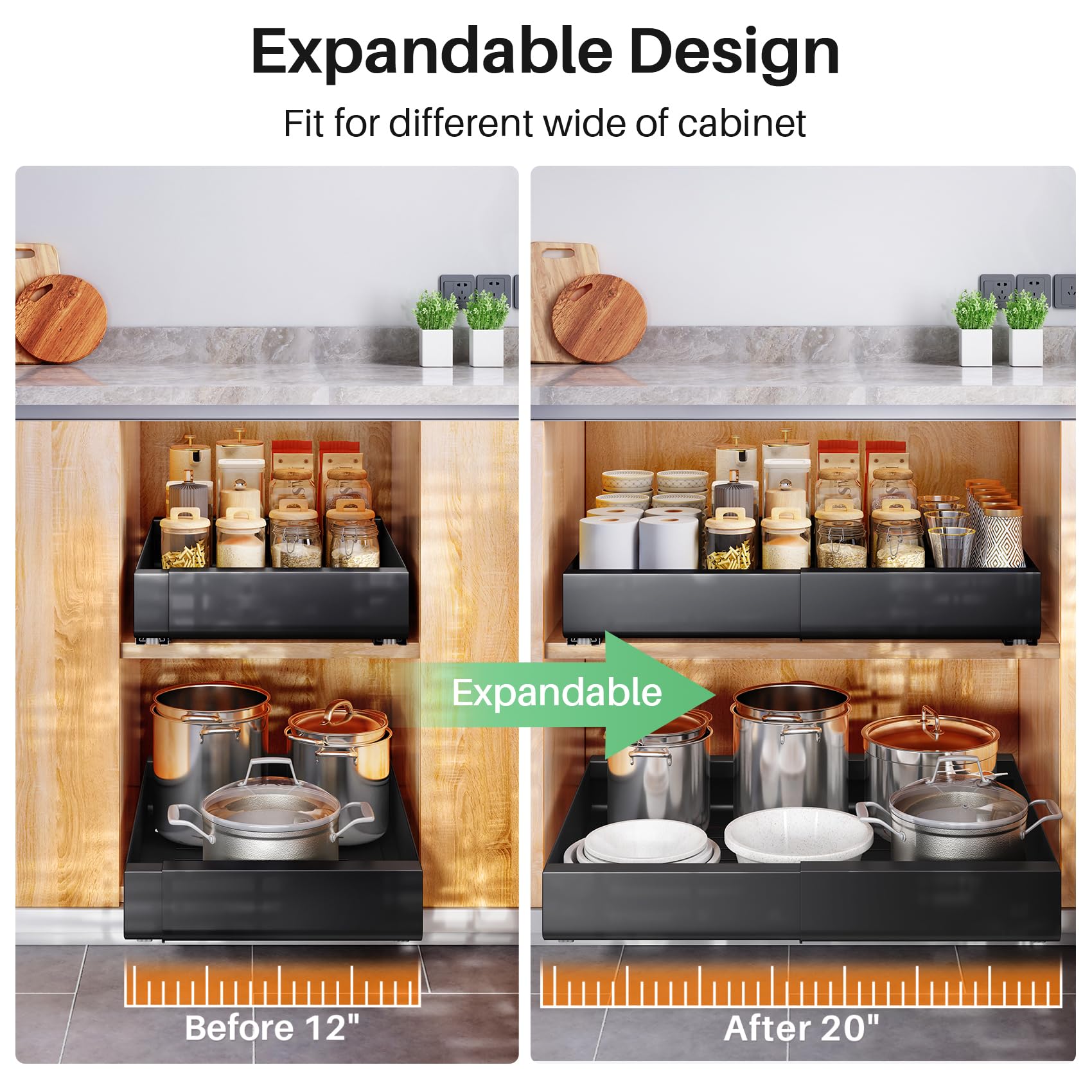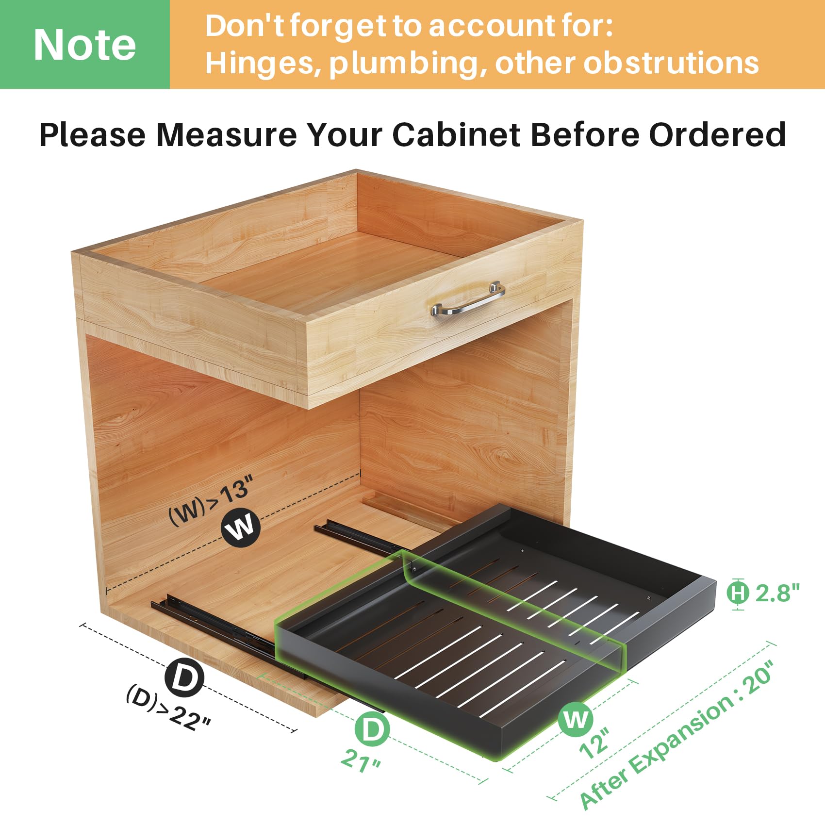 Important Notes: : Kitstorack pull out cabinet drawer organizer with an extendable design can be adjusted to fit different kitchens cabinets. It measures 21" d *2.8" h, and from 12" to 20" in width. Your cabinet width must exceed 13" and depth must exceed 22". Before deciding to purchase, we recommend you accurately measure the dimensions of your cabinets to avoid any mismatch issues during installation.