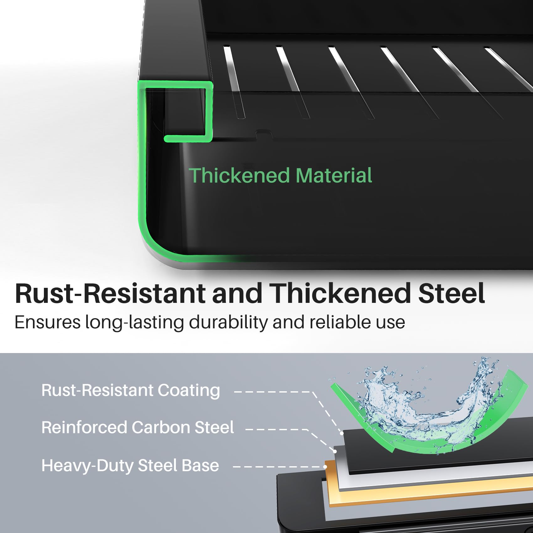 HEAVY-DUTY GAUGE PLATE: The pull-out cabinet organizer made of heavy-duty metal with an extra smooth sliding system to accommodate a large number of pots and pans, placing glides beneath the drawers, and not on the sides, maximizes every inch of your valuable cabinet space while providing a sleek and seamless look.