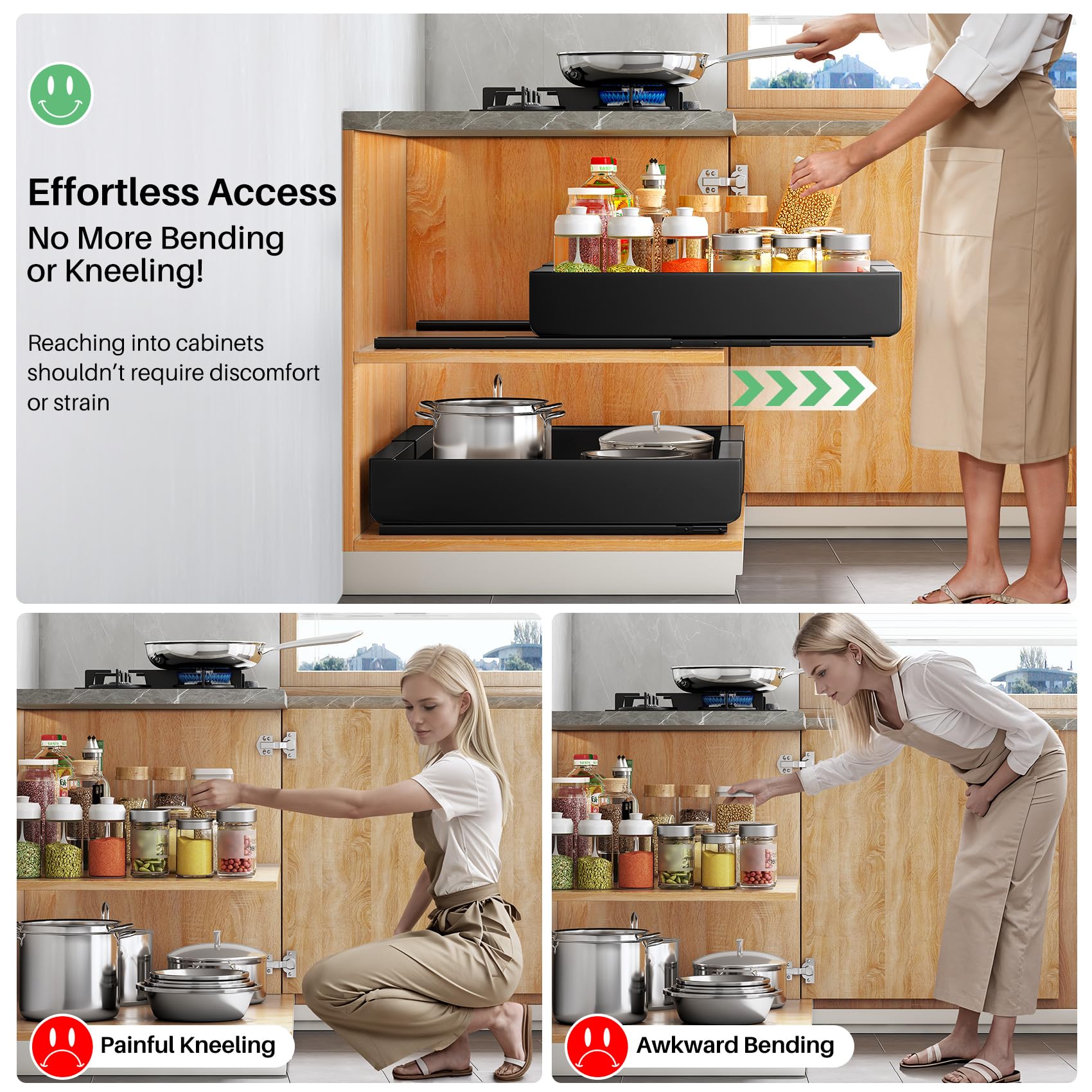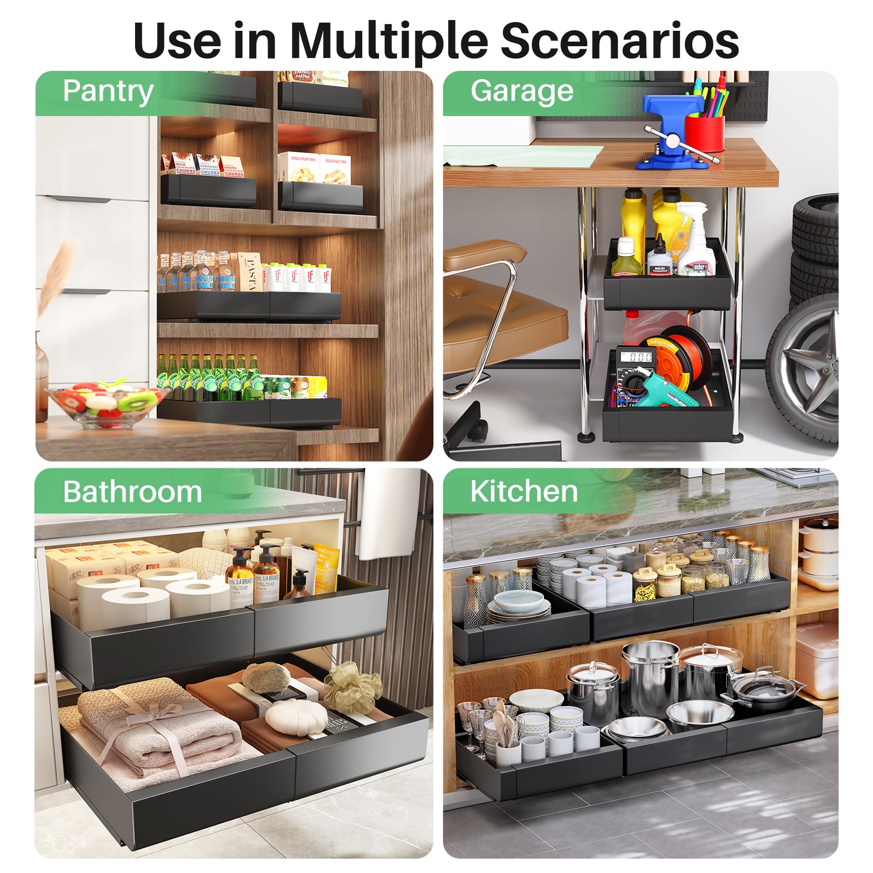 SLIDE OUT CABINET ORGANIZER: Organizing your cabinet space just got easier with the slide out cabinet organizer, you can make the most of cabinet space and easily access all your pots, pans, small kitchen appliances, cleaning products, canned goods, and other items.