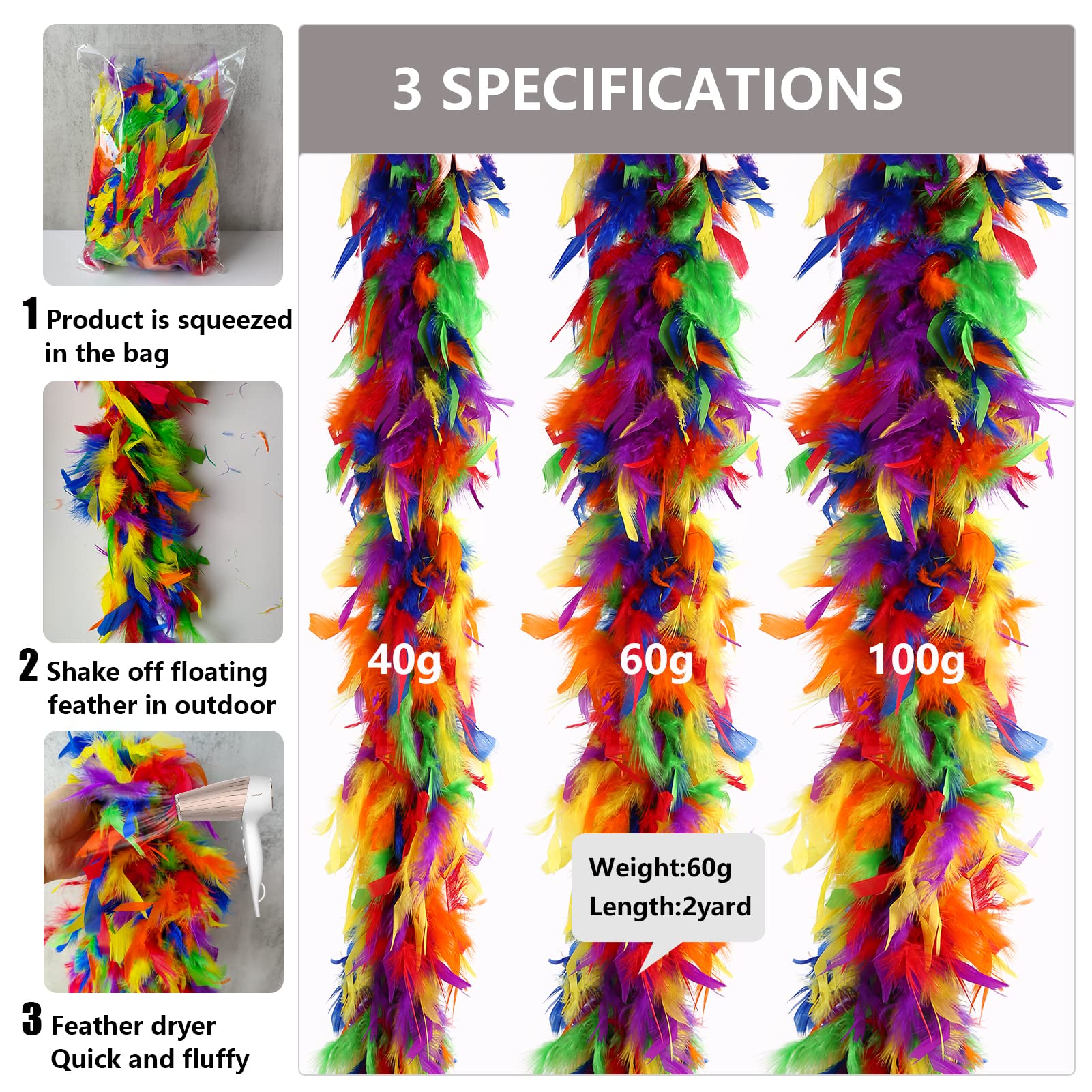 ❤️ Applications:These feather boas are perfect for dance performances,weddings,special events, Mardi Gras celebrations,Christmas parties, New Year’s Eve parties, Halloween parties, etc; also can be used on arts crafts project and holiday decoration.