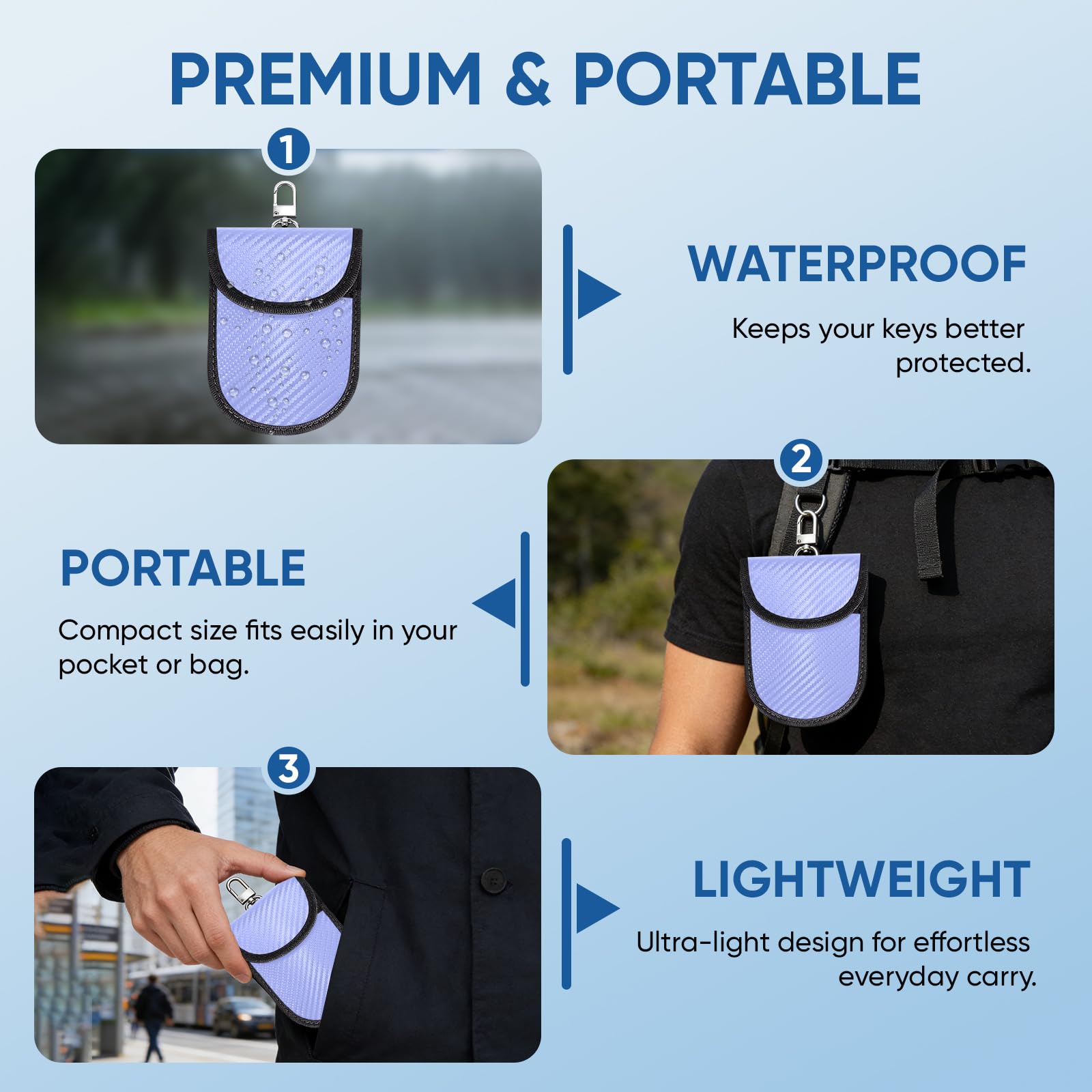 Convenience: The smaller/front pocket is anti-radiation, best for storing ID card, bank cards, etc; The larger/back pocket is for signal blocking, best for storing car key fobs