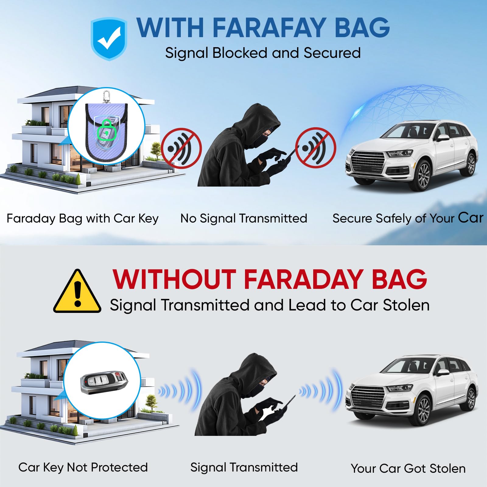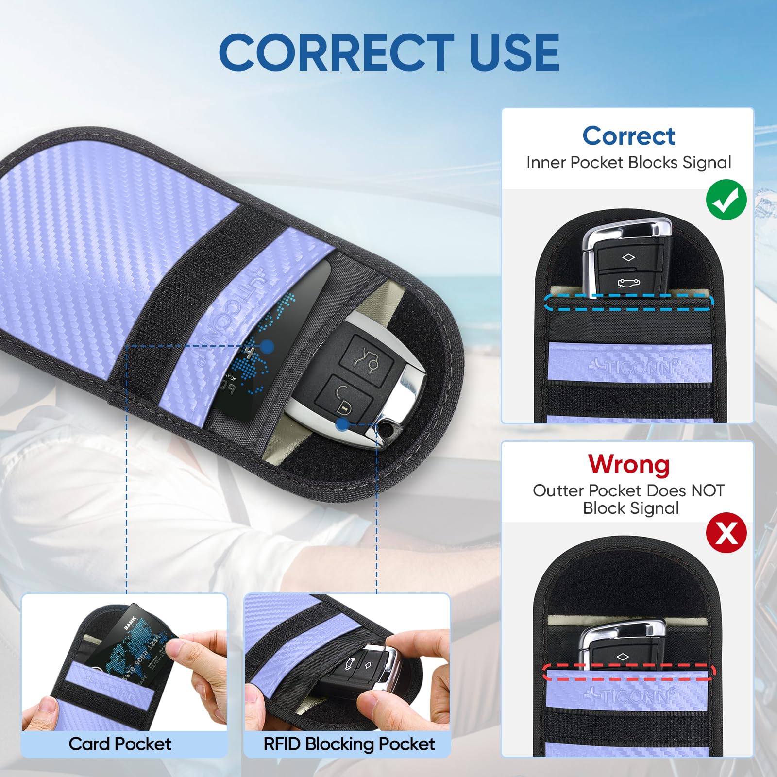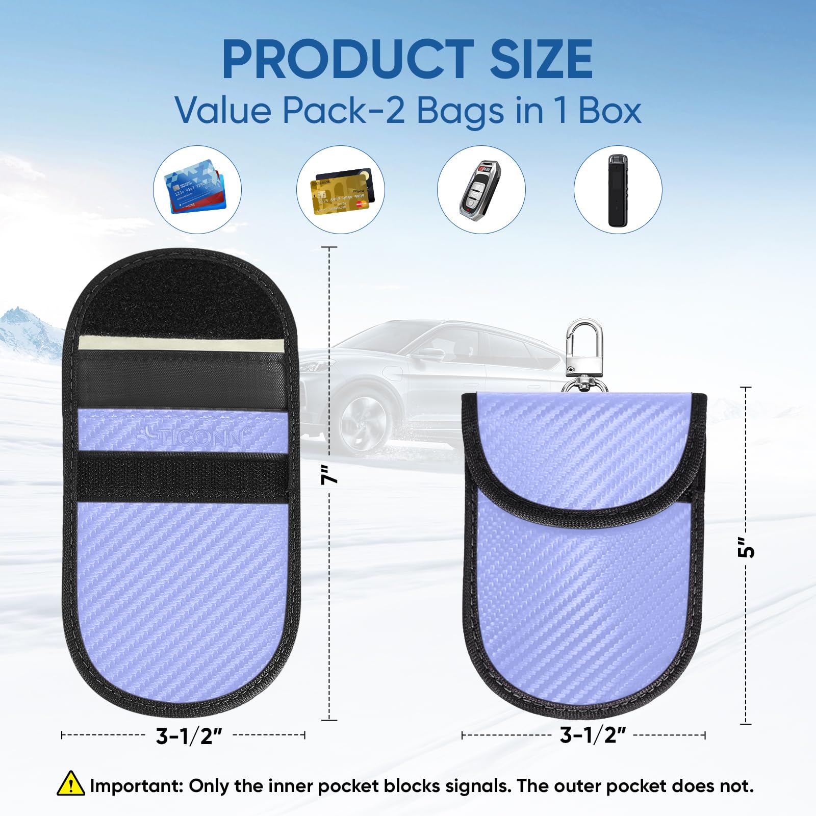 Why You May Need One: Get your car protected; TICONN faraday bag provides a complete signal blocker for your vehicle key fob; This prevents thieves from picking up and relaying signals from your key, to shield against break-ins and keyless ignition theft