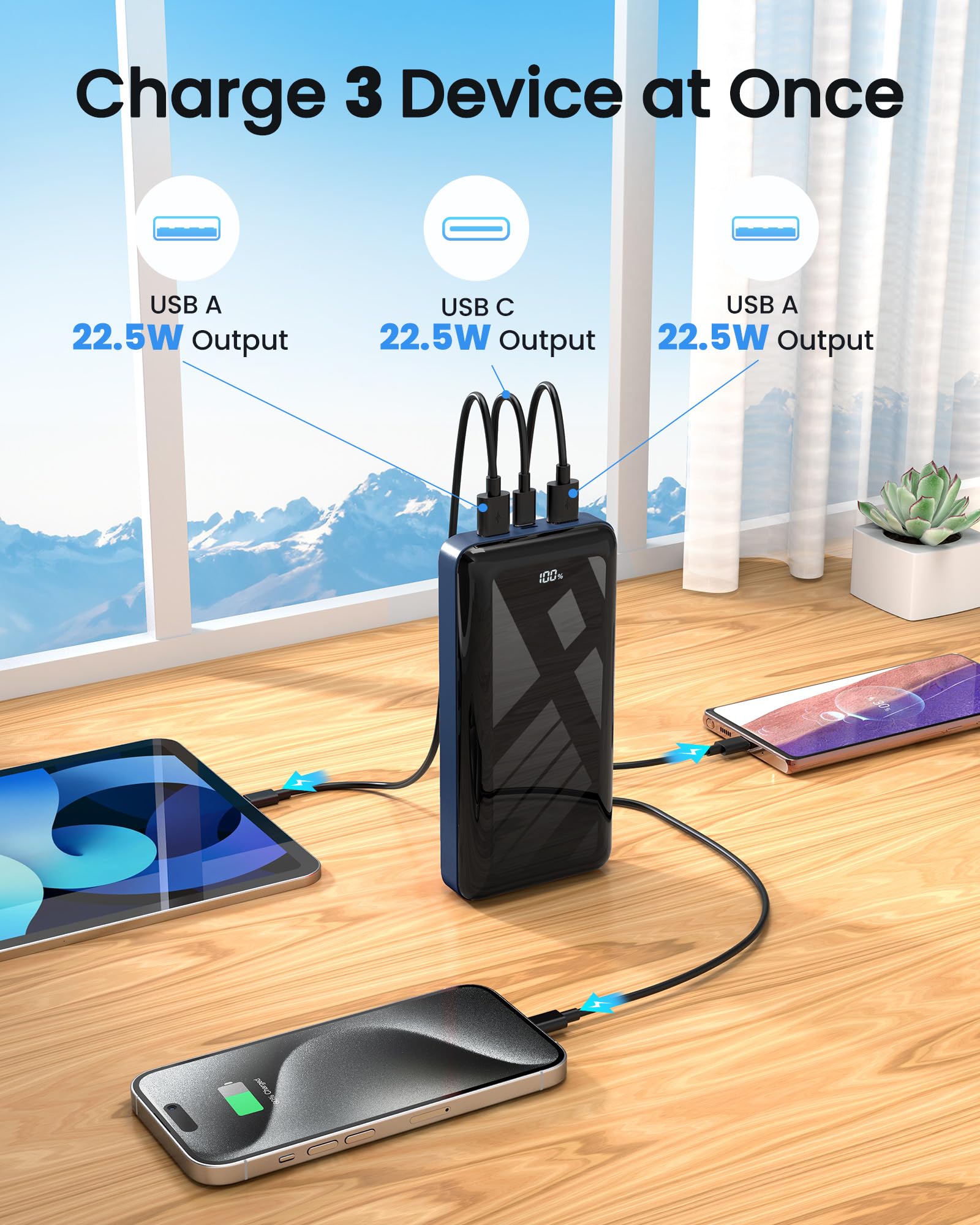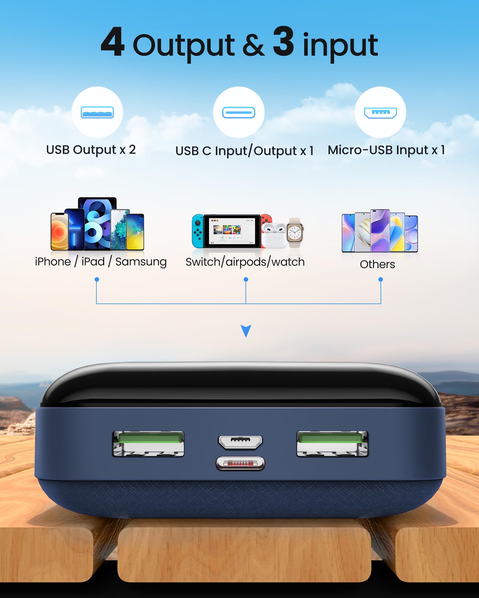 Multiple Charging Ports - 3 Outputs and 2 Inputs: Cell phone external battery power bank fast charging 3 devices simultaneously via USB1/2 outputs and a two-way Type C port. Share the power quickly with friends and family. Portable charger usb c widely compatible with smartphones, tablets, cameras, smartwatches, Bluetooth headsets, and other USB devices, portable power bank supporting both Micro and USB C inputs for flexible charging cables (Note: Not suitable for laptops)