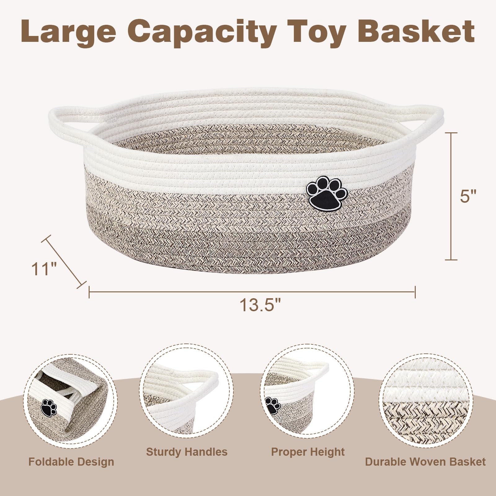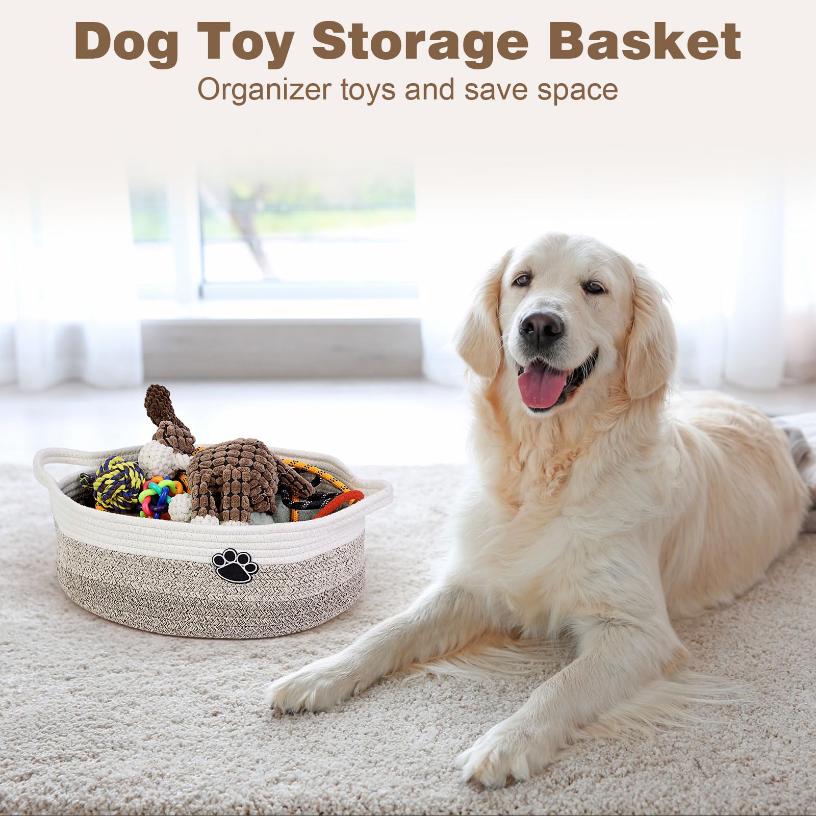 Pet Toy Storage Basket: The dog toy box measures 13.5 x 11 x 5 inches, which has a large space for many of your pet's accessories. It can hold dog toys, dog collars etc. The height of the toy box allows them to see all the toys and easily take toys out