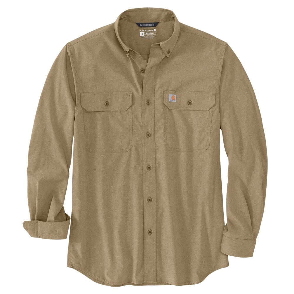 Description A comfortable go-to for hot days. This men's Carhartt button-down shirt fights sweat, resists odor, and dries fast. Lightweight chambray fabric with UPF 50+ adds extra defense when it's sunny out. Shoulder pleats give you room to move with ease.
