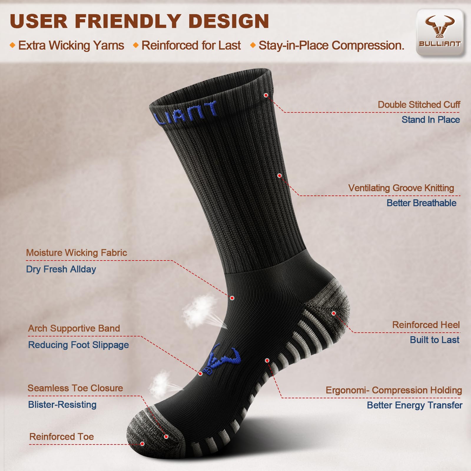 BREATHABLE--High efficient wicking yarns makes it quick moisture taking,the ventilation channels enhance its air flow,these socks can keep your feet dry all the day;