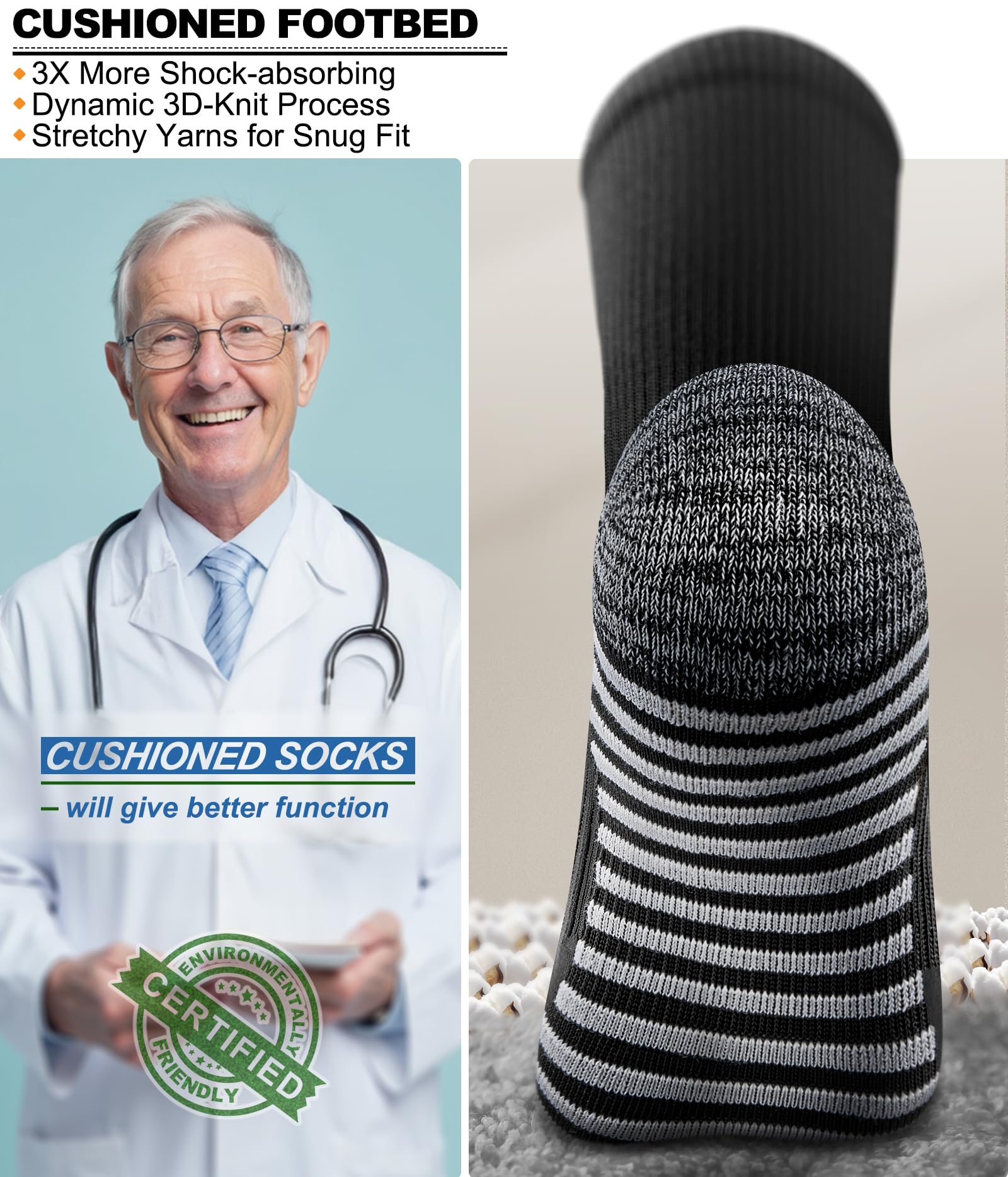 SURPORTIVE--Soft yarns makes it super friendly to the feet,full cushioned sole and arch support band gives the best shock absobing,these socks make you ever step comfortable and easier;