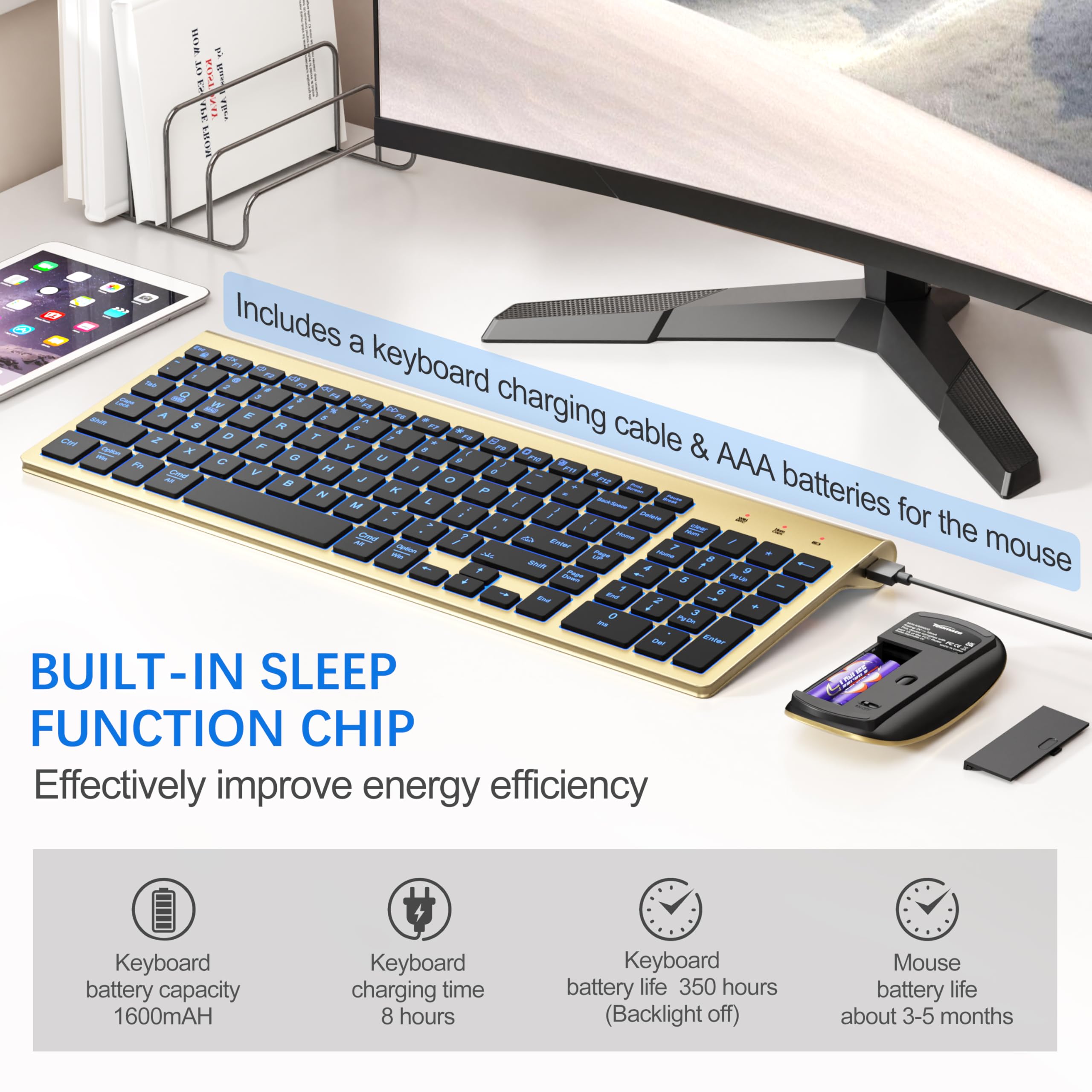 [Long-Lasting Battery & 2-Year Guarantee] The wireless light up keyboard comes with a built-in 1600mAh rechargeable battery and a charging cable, offering up to 350 hours of use with the backlight off. The mouse includes a AAA battery with a lifespan of 3 to 5 months (depending on usage). 2-Year Warranty: If any quality issues arise with the keyboard and mouse set within 2 years, we will provide a free replacement.