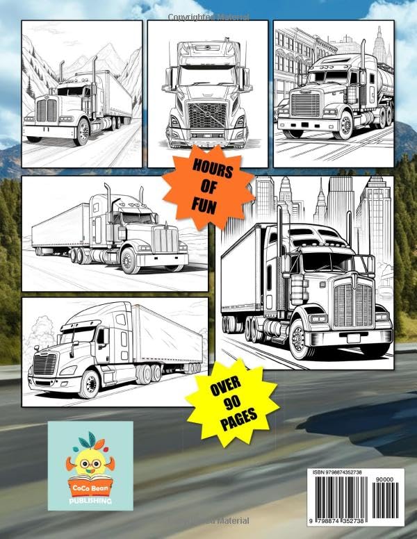 Key Features: 40 unique designs All designs are high quality and upscaled to over 300 dpi Printed on 55lb white paper Back pattern printed on each page to prevent bleed-through Some images are in landscape view for more coloring fun! Climb into the massive world of eighteen-wheelers with this fun coloring book featuring 40 uniquely detailed semi truck and trailer illustrations. Perfect for truck-loving kids and adults alike. Explore a variety of iconic rigs like classic Peterbilts, Kenworths, Volvos, Freightliners, Mack trucks and more. Each page features a detailed line art of pilothouses, chrome, custom paint jobs, majestic front grills, massive wheels, and boxy trailers of all types bringing these road kings to life. A great gift for professional truckers, trucking enthusiasts, auto buffs, or anyone who thinks big rigs are awesome. With illustrations ranging from simple to more complex details, this coloring book allows for engaging creativity. Perfect for passing the time on long hauls or display your artistic trucker pride by framing your colored creations. So grab your crayons, pencils, or marks and let’s roll good buddy!