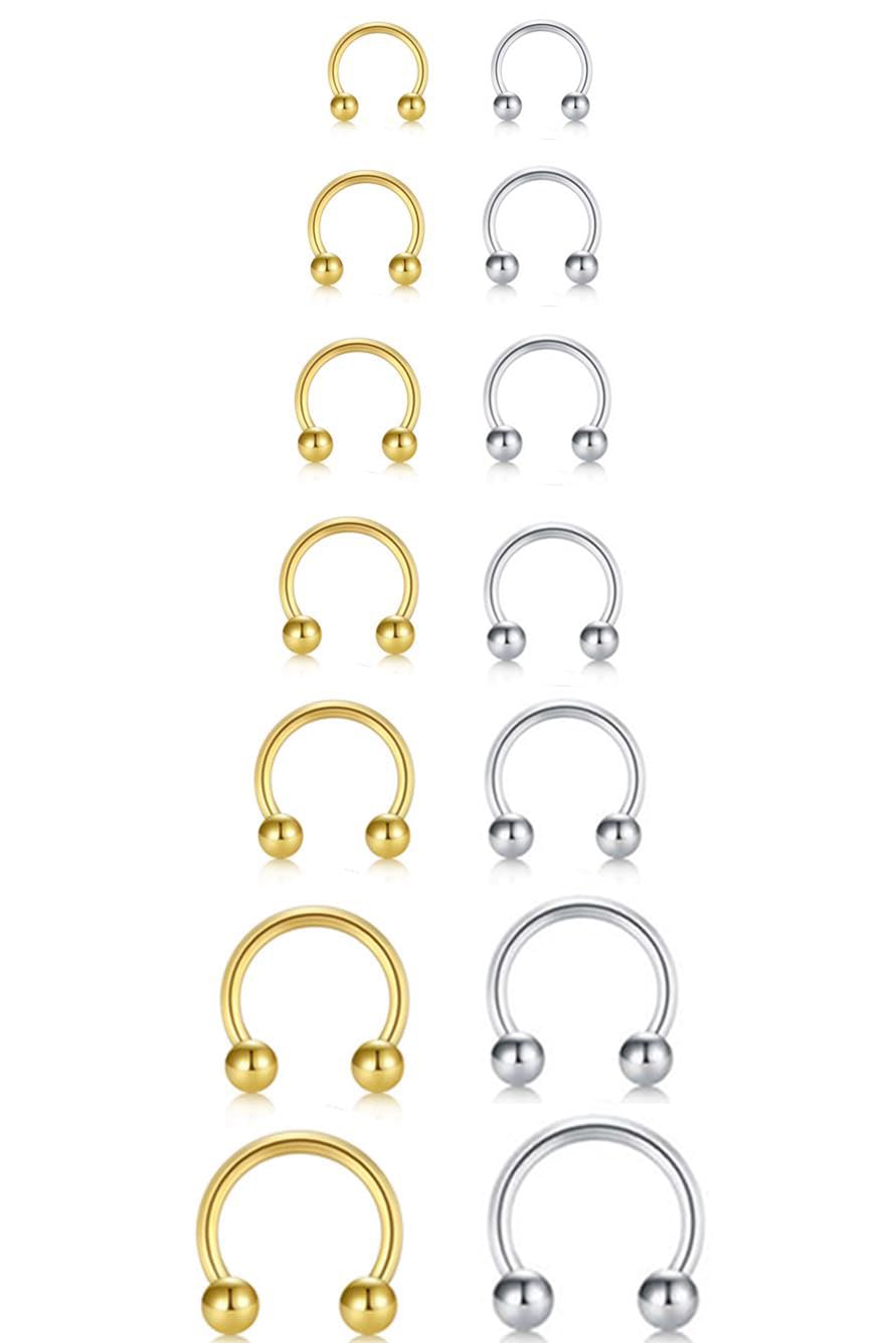 【1.】 Pack of 7 pairs circular curved barbells: Size from 6mm, 7mm, 8mm, 9mm, 10mm, 12mm and 14mm, Gauge size 20G (bar thickness : 0.8mm), Classic external threaded that easy to put on and remove and not easily lost