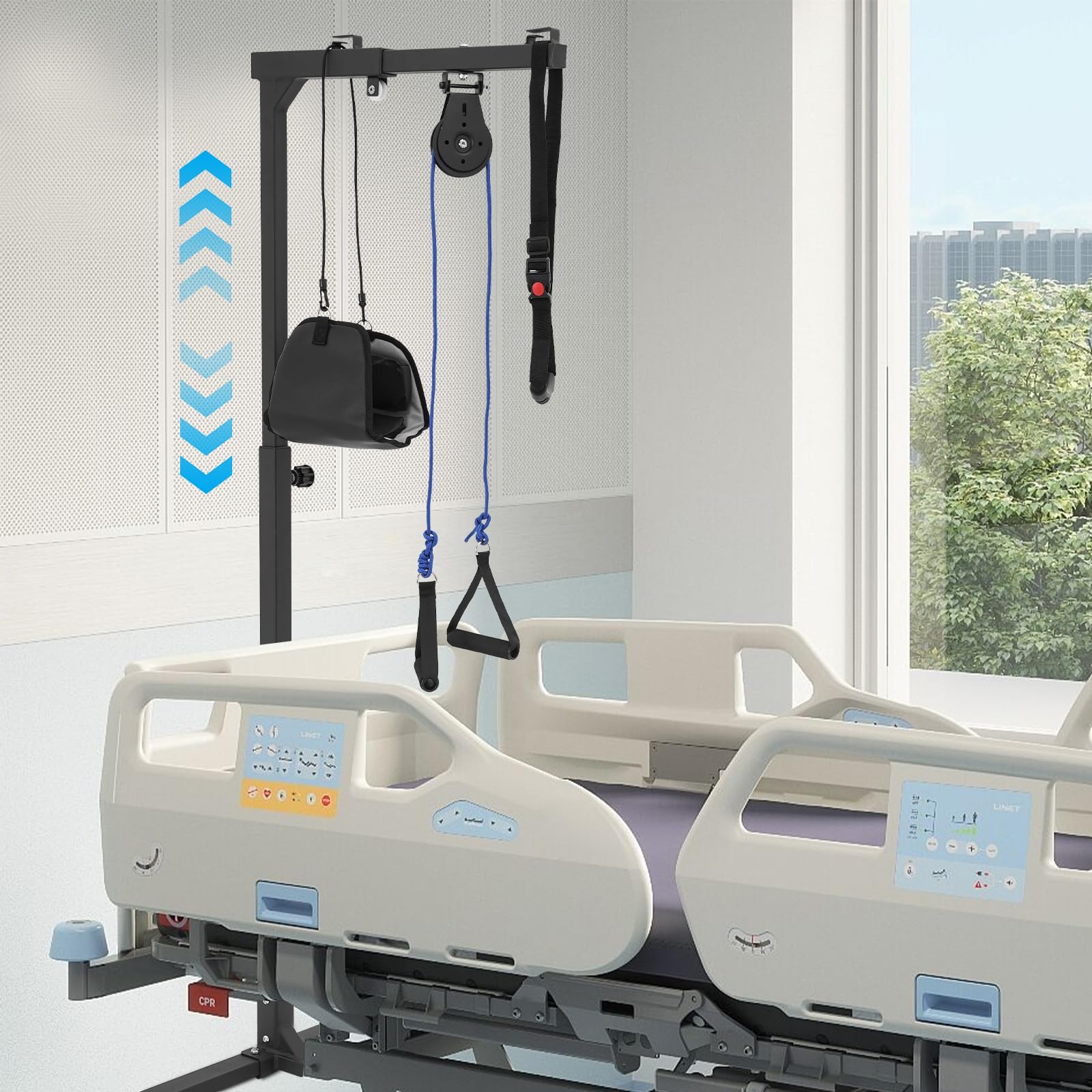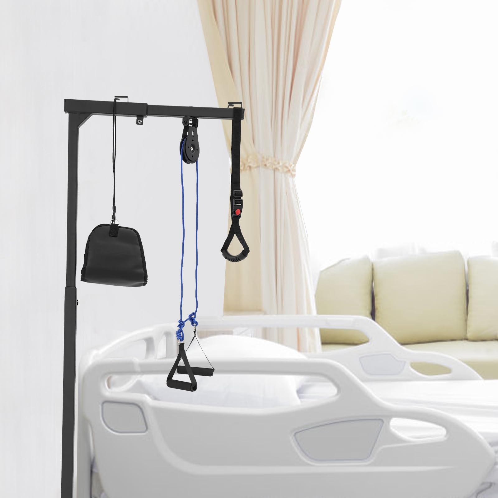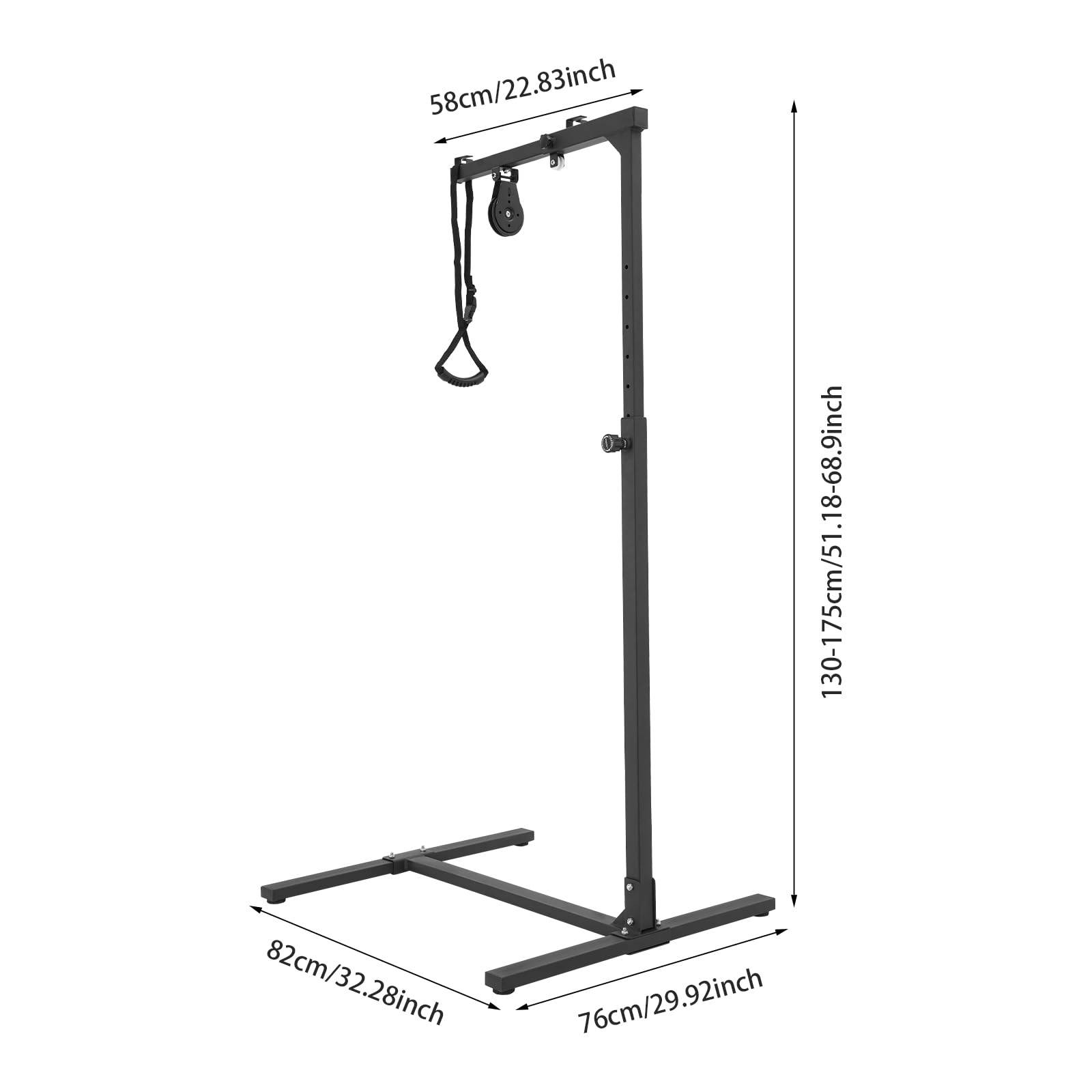 Description This multifunctional standing frame, designed with ergonomics in mind, provides intelligent assistance for standing up, making it easy and effortless. Paired with a shoulder joint traction device, a cervical traction device, a standing handrail, and a hanging pillow, it offers unprecedented convenience and care for both the elderly with mobility issues and those in rehabilitation who require special attention. How to Install 1. Use screws to securely connect the base crossbar with the side connecting rods. 2. Fix the 4 anti-slip feet to the base bracket. 3. Use screws to connect and secure the base with the support vertical rods. 4. Use screws and knobs to connect and secure the top connecting rod with the base body. 5. Use screws to connect and secure the top crossbar with the product body. 6. Installation is complete. Specification Mount Type: Floorstanding Assembly Required: Yes Support Tube Thickness: 1.5mm/0.06in, 3.5mm/0.14in Overall Load-capacity: About 100kg/220.46lbs Material: Steel Craftsmanship: Spray Painting, Welding Colors: Black Height Adjustment Range: 9 Levels (130-175cm/51.18-68.9in) Base Size (L*W): 82*76cm/32.28*29.92in Top Rod Length: 58cm/22.83in Packaging Size: 105*16*29.5cm/41.34*6.3*11.61in Gross Weight: 11kg/24.25lbs Net Weight: 10.45kg/23.04lbs Package Included 1* Multifunctional Standing Frame 1* Standing Handrail 1* Shoulder Joint Traction Device 1* Hanging Pillow 1* Cervical Traction Device 1* Chinese Functional Component Installation Diagram 1* English Schematic Description 4* Feet Other Mounting Accessories