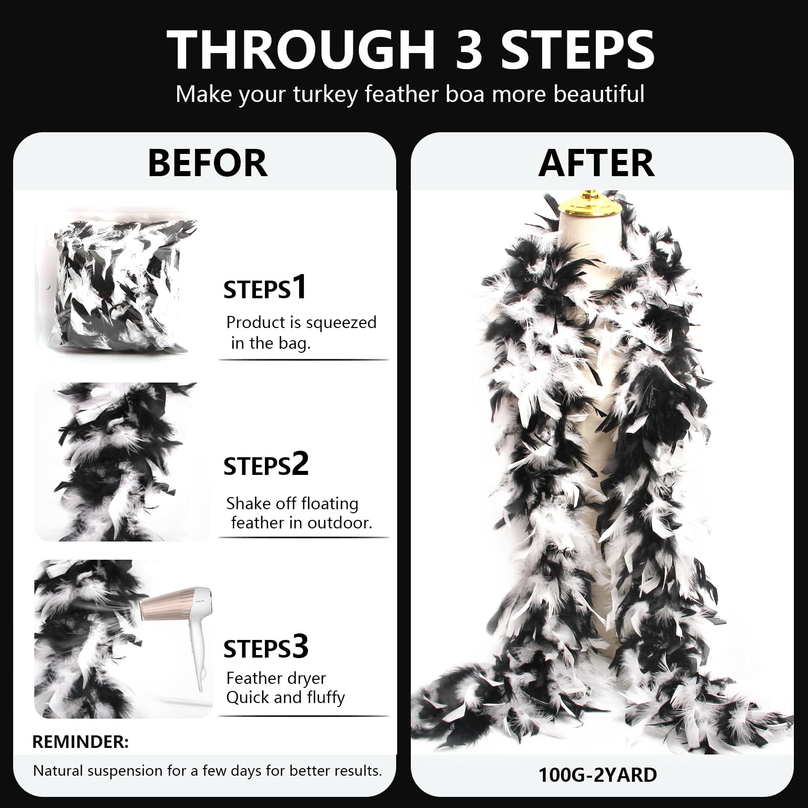 ❤️Precautions before use:Since our feathers are all natural and handcrafted,After you receive the boas, take them out of the package and shake them outdoor first, in order to get rid of debris and fallen feathers.Then hang it up for few hours before wearing. If you can hang up blowed few days, it will looks as the picture full and big.Of course,the longer you hang them up, the turkey feather boa will be more fluffy and the effect will be more stunning.