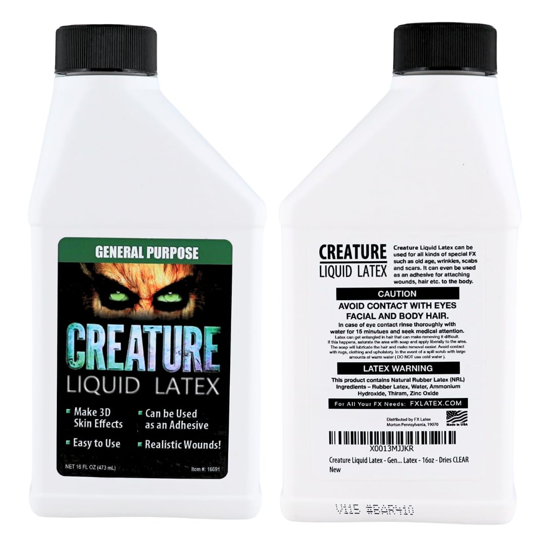 Become the Monster you always wished to create with our Creature Liquid Latex! Our general purpose latex is perfect for Halloween Zombie costumes, gorey effects, and not limited to any type of wound or gash! Creature Liquid Latex dries CLEAR to make blending effortless. This type is made to be thin so you can get detailed edges without the clumping other thicker latex products have. When only the finest will do, save money and get more out of Creature Liquid Latex!
