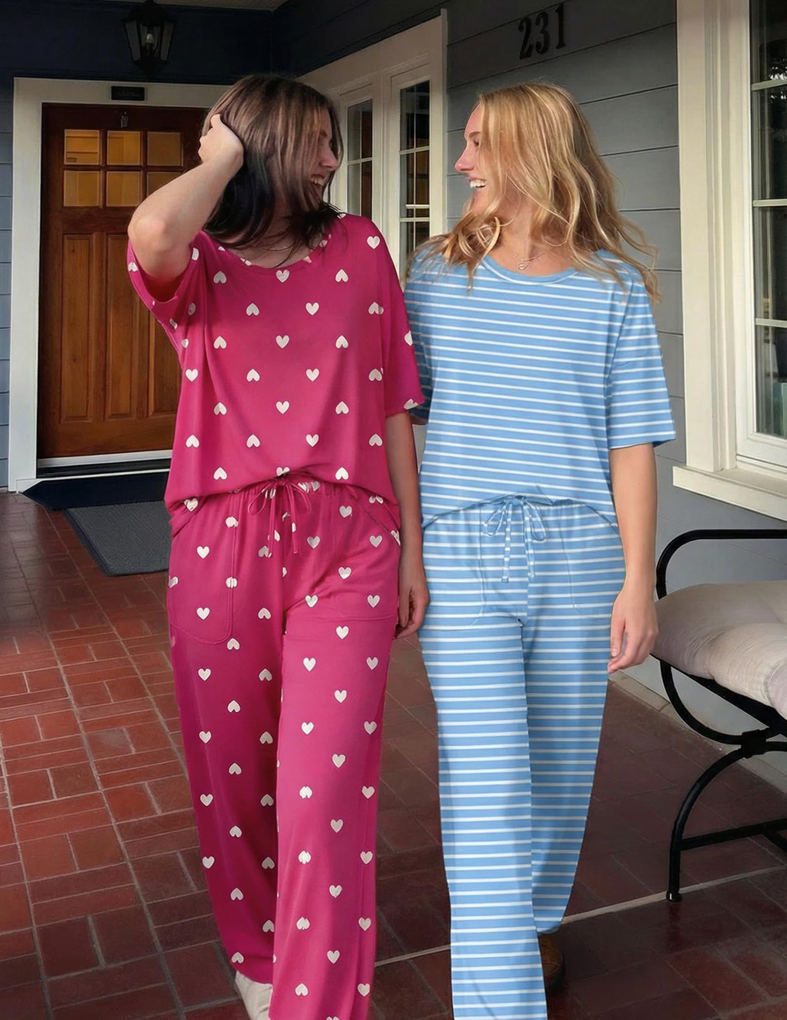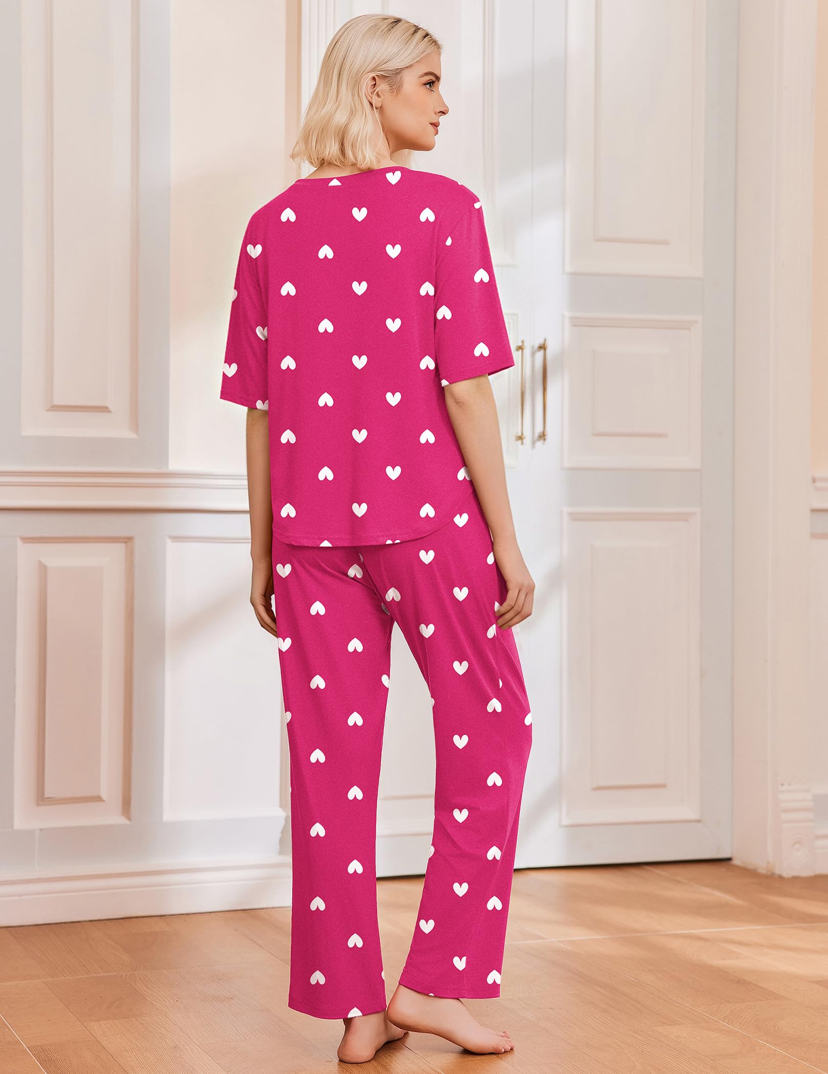 Description Ekouaer 2 Pack Womens Pajamas Set Casual Short Sleeve Sleepwear Top and Pants Pjs Lounge Set with Pockets Indulge in timeless elegance with our Pajama Set for women designed cozy, comfort, and versatility effortlessly. Why choose this set? Super Soft Pajamas:Ultra-soft,breathable and skin-friendly fabric keeps you warm in winter and cozy in spring&summer,Providing cloud touch,help you have a sound sleep. sleep set for women Simple Design:Pjs featuring classic sleepwear style. short sleeve,round neck pajama tops,loose pj pants with 2 side pockets,adjustable drawstring waist which helps the bottoms to loosely hug the hips.Easy to get on and off. Functional 2 side Pockets:Loungewear with two side pockets keep phone, glasses or some small stuff within easy reach while lounging. Set includes:two short sleeve pj tops and two full length pajama bottoms,makes you have multiple choices to wear and save money,mix and match. Age-Inclusive Sizing: Available in a wide range of sizes (S-XXL) to suit teens, young adults, and mature women. Various Occasions:Perfect as sleepwear loungewear for Christmas Day, New Year, Valentine's Day, pajama parties, bridesmaid pajamas on wedding night, or relaxing around the house.It is a must-have addition to your wardrobe collection.It will become your new favorite sleepwear set! Good choice as a gift to lover,mommy and daughter,girlfriend, wife,daughter,or sisters ,friends. Care & Maintenance: Machine-washable for easy upkeep,also retains shape well and no shrinkage.
