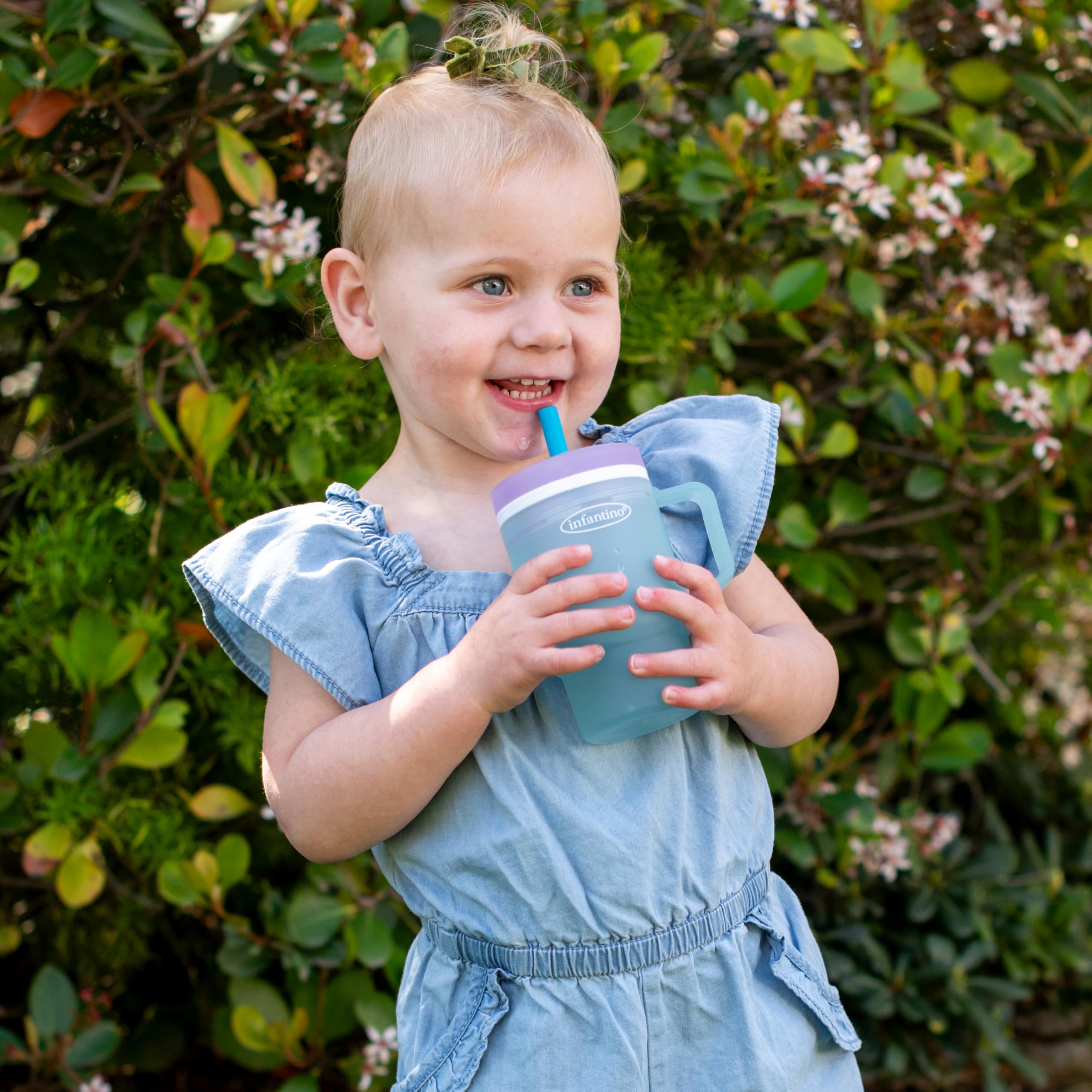 Double the sipping fun with the Infantino My 1st Tumbler 2-Pack! These are the perfect starter cups for toddlers ready to drink on their own. Each 10oz tumbler is lightweight, easy to grip, and features a built-in handle that’s just right for little hands. The soft silicone straw tip is gentle on little mouths and gums. A smart valve helps prevent spills and messes, even when flipped upside down. Made from BPA-free plastic, these cups are safe for daily use and durable enough to handle drops, tosses, and tumbles. Designed to fit most stroller and car seat cup holders, they’re great for home, daycare, or on-the-go adventures. All parts are top-rack dishwasher safe for easy cleanup.