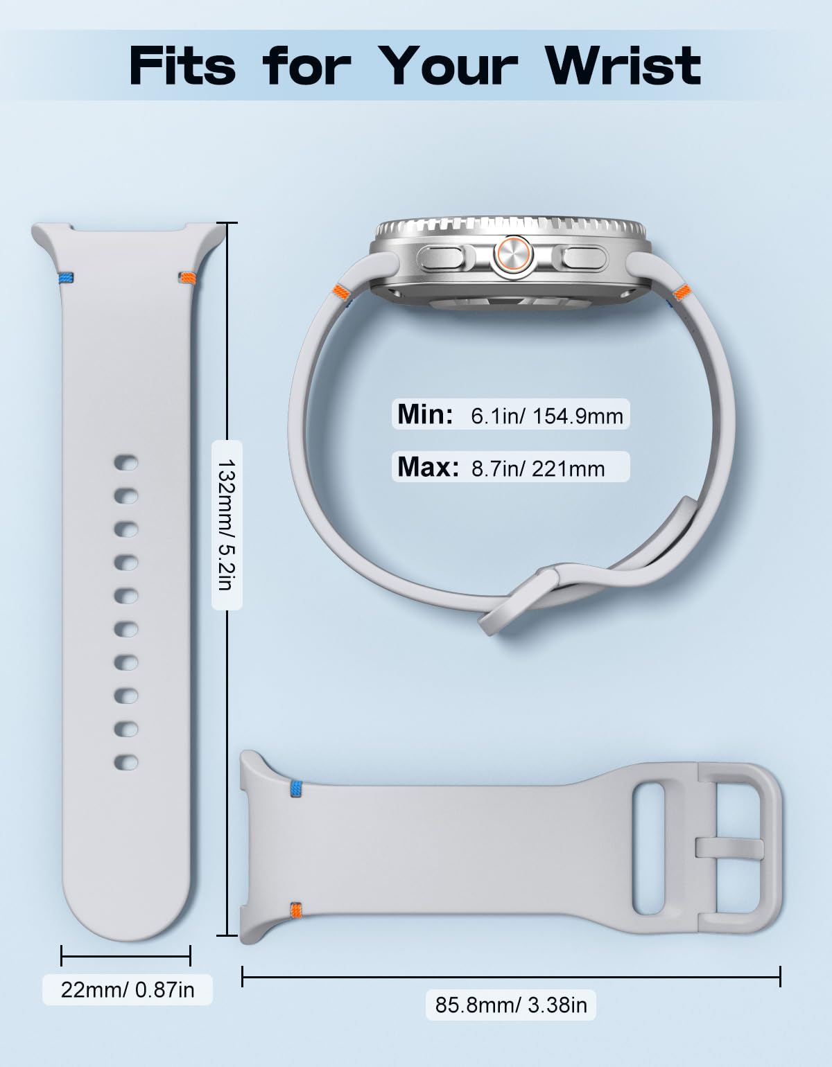Wrist Size: The Galaxy Watch 8 40mm band is available in a variety of colors to match different outfits and moods. Suitable for women and men. It is adjustable, S/M fits 5.3" - 7.5" (134.6 mm - 190.5 mm) wrists and M/L fits 6.1" - 8.7" (154.9 mm - 221 mm) wrists. The metal buckle holds the watch securely in place, and you can also tuck the band underneath.
