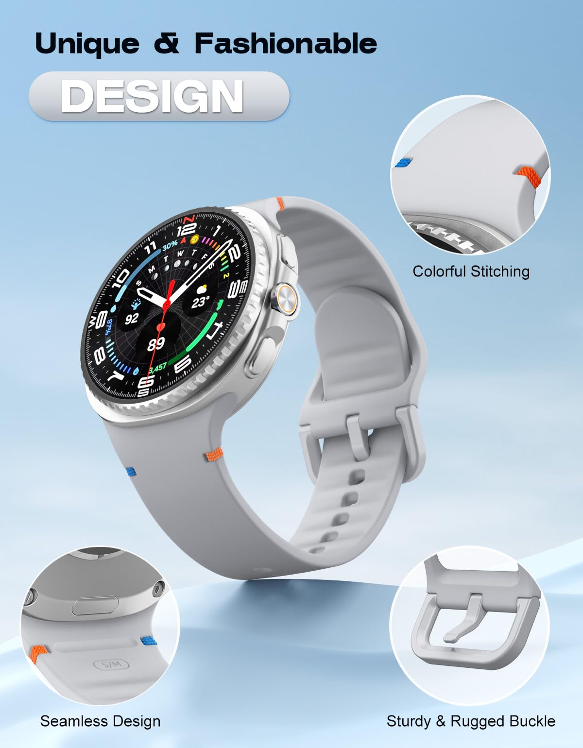 Seamless Design: The Galaxy Watch 8 band is accented with colorful stitching, adding a touch of elegance to your wrist, and the rippled design inside the band allows for easy drainage and quick drying of sweat. It has a lugless design that blends seamlessly into the body of the watch, ensuring a sleek look and comfortable fit, especially during intense exercise.