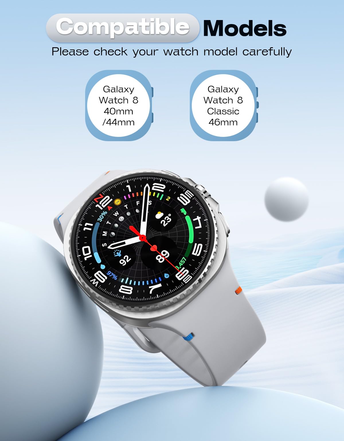Compatible Models: This soft silicone band is only compatible with Samsung Galaxy Watch 8 band 40mm/44mm and Galaxy Watch 8 Classic band 46mm. Note: Smartwatches are not included.
