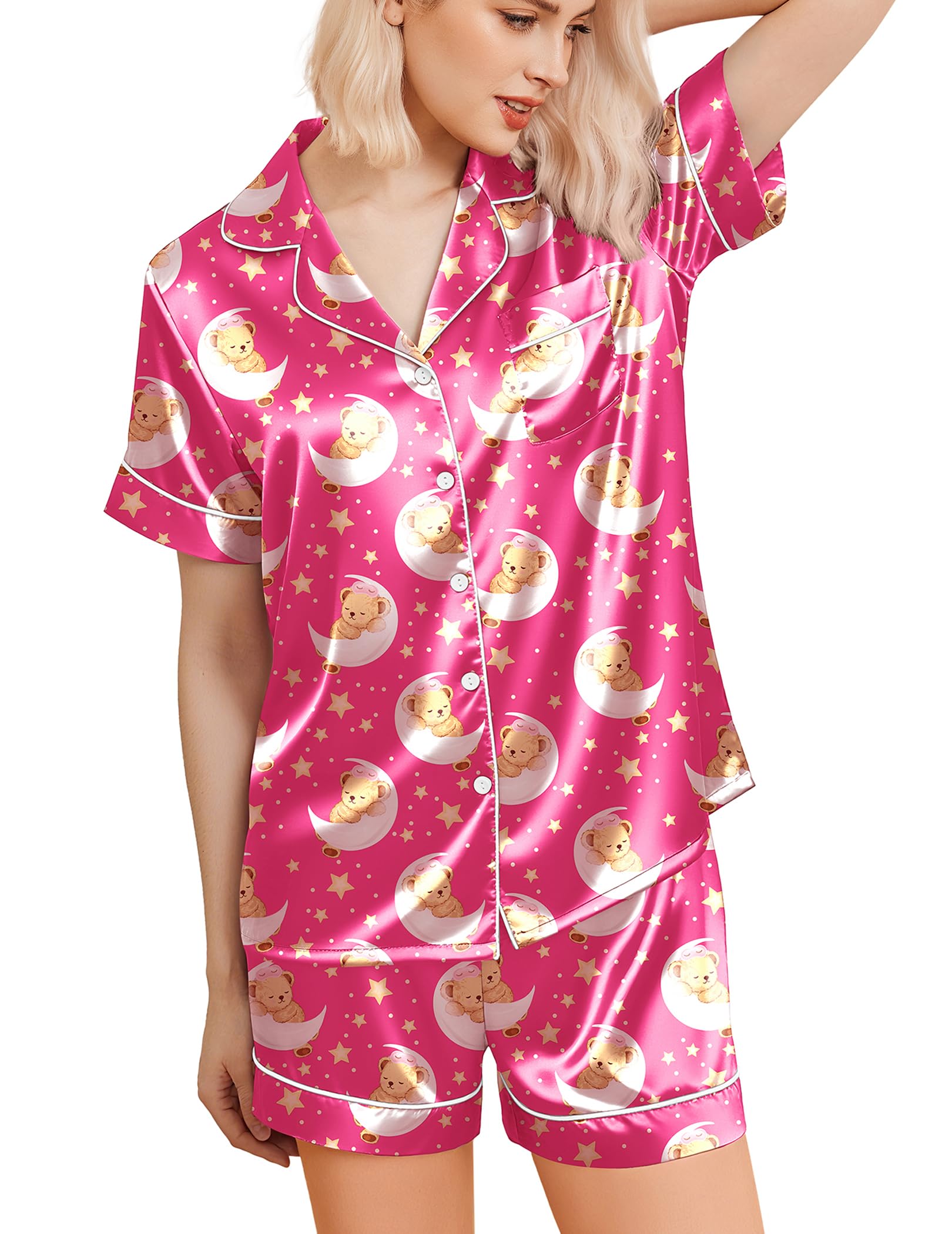 Elegance Features:Pajamas for women set with funny teddy print,Short sleeve tops, button down front,notch lapel collar and one chest pocket.Matching pajama shorts for women with stretchy elastic waist that fits for any body size.Lightweight & Breathable,perfect for sleeping, lounging, or morning coffee in effortless grace