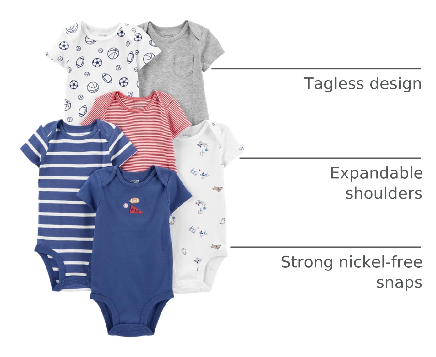 Description Simplify dressing your baby boy with this 6-pack of short-sleeve bodysuits from Simple Joys by Carter's. Each bodysuit features expandable shoulders that make it easy to slip over your baby’s head, while the strong, nickel-free snaps ensure quick and hassle-free diaper changes. Made from 100% soft and breathable cotton, these bodysuits are gentle on your baby's skin and perfect for everyday wear. The tagless design eliminates irritation, keeping your baby comfortable all day long. With OEKO-TEX Standard 100 certification, you can trust that these bodysuits are safe and free from harmful substances. Available in a convenient 6-pack, these bodysuits provide exceptional value and are designed to mix and match easily with any outfit. Simple Joys by Carter's delivers high-quality, stylish clothing at affordable prices, making this 6-pack a smart choice for parents looking for both quality and value.